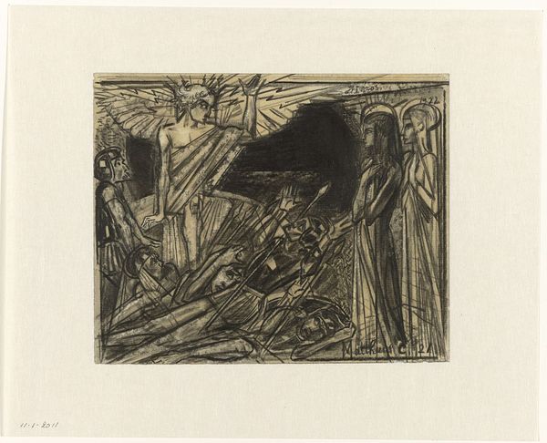 Curator: This is Antoon Derkinderen’s etching from 1886, titled "Tussen de kramen", or "Between the Stalls". Editor: My first impression is of a hidden world, shadowed by a kind of canopy. The image seems densely packed, like a collection of hushed secrets being bartered. What mood does it strike for you? Curator: I find the figures recall medieval woodcuts in their construction. Notice how each is cloaked and individualized—revealing perhaps the singularity within a communal, industrious setting? Editor: The etching is quite dark overall. Given the probable speed of its making compared to painting, for example, do you think the shadows are a reflection of time constraints or is the artist deliberately imbuing it with meaning through stark contrasts? Curator: A bit of both, likely. Etching, while efficient, is also indirect. The acid etching of the plate would’ve deepened those shadow areas, heightening the narrative tension inherent to marketplace scenes since the medieval period: commerce versus morality. The canvas tarps overhead also introduce visual echoes of religious tabernacles and ceremonial canopies. Editor: Looking at the canopies you mentioned, I wonder about their raw, textile reality in this context: Were they new or patched-up? Mass produced or locally sourced? And what about the clothing: What labor produced those clothes? These are vital material stories not apparent, but deeply informing this imagery of exchange. Curator: Material origins influencing visual language; very interesting. I'm now drawn to how Derkinderen might have thought of genre painting as inherently pedagogical; conveying moral lessons of the market and labor relations within it through visual language? Editor: Fascinating, because if the labor narrative seems unclear to the contemporary viewer now, perhaps it still hints at the socio-economic imbalances endemic even to contemporary trade. It is interesting how it all translates into the etching medium. Curator: Yes, this work truly exposes both cultural memory and artistic innovation. Editor: Indeed; each choice, material and artistic, leaves resonant imprints.