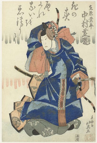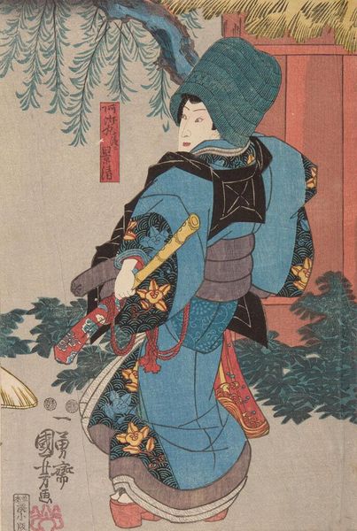 Curator: Gaze upon "An English Soldier," a print created by Utagawa Hiroshige II that, with its meticulous lines and vivid color, offers a window into how Japan saw the world. Editor: There's such a playful, almost theatrical quality to this soldier. He stands so stiffly, like a toy soldier come to life, and the sheep looks so docile in comparison. Curator: Indeed, the formal elements suggest a blend of cultures. Notice how the artist uses traditional woodblock techniques to depict this foreign figure. The bright blue of the uniform pops against the softer greens of the landscape. Editor: And the animals hanging behind him—fish and fowl—feel both decorative and slightly unsettling. It’s an interesting juxtaposition of the exotic and the everyday. Curator: One cannot ignore the texture achieved with the medium; there’s a distinct flatness. This emphasizes the soldier’s presence as both powerful and slightly removed. The composition guides our eye right to the man's resolute face. Editor: It does make you wonder what the artist truly felt. Was it curiosity, admiration, or maybe a hint of caution? Curator: Precisely. This artwork remains a fascinating artifact. Editor: A cultural snapshot—leaving much to ponder.