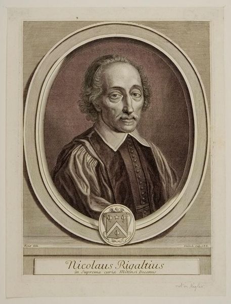 This is Gérard Edelinck’s ‘Portret van Nicolas Rigault’, an engraving now held at the Rijksmuseum. The portrait employs a stark monochrome palette and meticulous line work, characteristic of the engraving process, to capture Rigault in fine detail. The oval composition draws the eye to the restrained realism of the face and hair, contrasting the sharp, formal lines of his clothing and the heraldic shield beneath. Edelinck’s choice of the engraving medium is significant. The rigorous process allows for precision and clarity, imbuing the image with a sense of the sitter's intellectual gravity. The contrast between light and shadow is stark, creating a formal tension. The symmetry in the outer frame, the curve of the inner oval, and the clean lines of the lettering at the base contrast with the subject’s more fluid and relaxed pose. The texture of the paper and the etched lines remind us of the materiality of the artwork itself. By exploring the formal qualities, we can appreciate how it both reflects and shapes our understanding of the subject and his time.