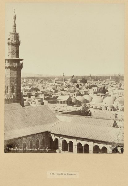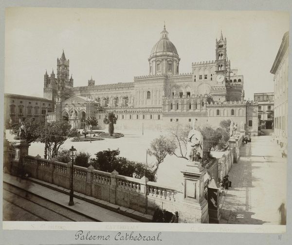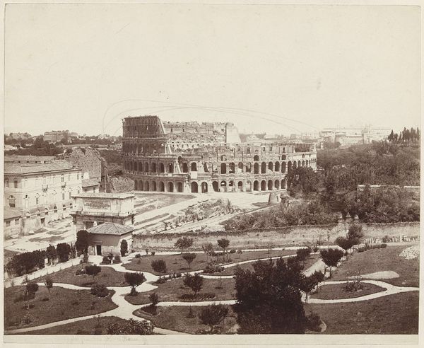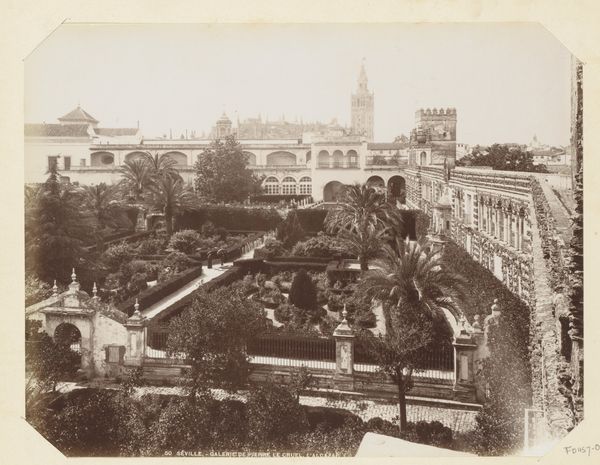 Curator: We're looking at a photograph by Emilio Beauchy, titled "Gezicht op de tuinen van het Alcazar in Sevilla," dating roughly between 1860 and 1880. It's quite something, isn't it? Editor: A bit faded, a touch sepia-toned...but undeniably romantic. There’s something dreamlike in its softness. Almost makes me want to fan myself languidly on a wrought-iron bench. Curator: It definitely evokes a specific atmosphere. Now, consider Beauchy’s photographic practice; this wasn’t a spontaneous snapshot. He would've been lugging heavy equipment, meticulously preparing his plates, and spending a considerable amount of time to capture this view. That level of craft is visible in the detail. Editor: Absolutely. And think of the social implications—the gardens themselves, so carefully manicured, speaking volumes about labor and class. This wasn’t accessible to everyone; it’s a vision of privilege captured with an expensive, labor-intensive process. The photograph itself becomes a kind of status object, doesn't it? Curator: It does highlight the power structures embedded within representation. But let's not overlook the artistic choice. Beauchy wasn’t merely documenting; he was framing, selecting, imbuing this space with his own vision of serenity and order. Notice how the architecture rises subtly behind the organic shapes of the garden? It’s a wonderful juxtaposition. Editor: Though, to play devil’s advocate, I can’t help but think about the potential artifice in this 'natural' scene. The labor behind constructing and maintaining such manicured gardens gets erased. Instead, we're left with a sanitized vision, crafted for consumption. Curator: A fair point. But perhaps we can also see it as an early form of place-making through photography. He is shaping a particular image of Spain for both locals and visitors alike, feeding into this broader cultural fascination with "exotic" locales. Editor: Hmm, the ‘Orient’ packaged for European consumption, so to speak? Still, those palms—it is Seville, after all, a confluence of cultures that speaks through material itself. It's such a layered piece. Curator: Precisely. The photograph functions on multiple levels. From the chemical processes involved in its creation to the colonial undertones it whispers, it provides plenty to consider. It remains compelling. Editor: Yes, compelling and wonderfully complicated. Now, I really do want to go wander around a garden somewhere!