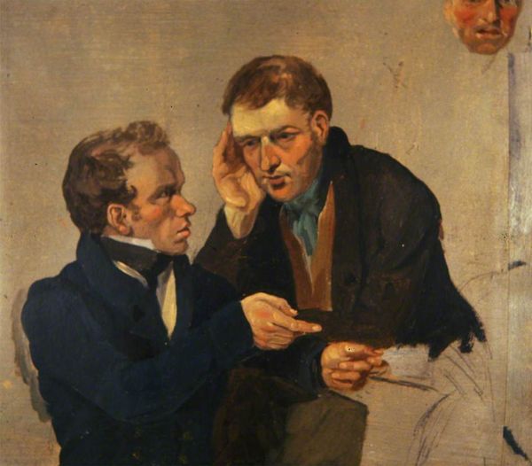 Curator: I'm struck by the tension in this image. The use of light and shadow emphasizes the subjects' expressions, creating a very specific mood. Editor: Indeed. We're looking at George Harvey's 1827 oil painting, "Law Agent and His Client." It offers a fascinating glimpse into the socio-political structures of the time. Academic art such as this was meant to serve the public. Curator: Absolutely, and thinking about who is represented is really crucial here. It’s like peering into a moment of potential crisis or opportunity. Their body language tells a story, doesn't it? The positioning suggests a power dynamic that goes beyond the professional sphere. We might ask ourselves who these figures really are and where are they coming from. Editor: Well, if we consider the historical context, we can explore the social implications of law during that era. This work, like much art in its era, can tell us about class, about wealth and about justice in early 19th century Europe. There's the agent, a man clearly in control. And the client, the way his hands flutter. He is clearly vulnerable. What might this exchange be about? Who profits from this transaction? And at whose expense? Curator: The way they're depicted, one can almost feel the societal pressures they faced—Harvey certainly knew that these themes resonate on more than just an aesthetic level, highlighting real-world issues. One wonders if justice has even been served to them. Their story extends well beyond the walls that house their forms, challenging us to address enduring injustices. Editor: Yes, and think about the use of romanticism. Its impact extended into visual propaganda on behalf of new forms of capitalist realism, reflecting both control but also chaos, like smoke and mirrors! Curator: In that sense it gives us access into thinking about justice today. I think there's real merit in considering artwork's function as social mirror – revealing, sometimes uncomfortably, the underlying mechanics that affect daily living conditions. Editor: A mirror that reveals as much about the present as it does about the past. Food for thought.