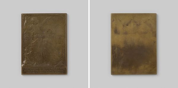 Editor: We are looking at a metal relief sculpture, or plaquette, commemorating the inauguration of Queen Wilhelmina of the Netherlands in Amsterdam, prior to 1898, made by Koninklijke Utrechtsche Fabriek van Zilverwerken van C.J. Begeer. The classical figure seems to be ushering in a new era. What story does this piece tell, in your view? Curator: It's a fascinating piece of historical imagery. Consider the sociopolitical context: Wilhelmina's ascension marked the end of a regency, a time of political maneuvering. This plaquette, offered by the city of Amsterdam, isn't just celebratory; it's a carefully constructed narrative. Notice the figure—she’s allegorical, not a straightforward portrait. Who is she, and what does her gesture imply? Editor: She looks like a classical figure, pointing towards… the future, perhaps? Is that the Royal Palace behind her? Curator: Precisely! And her classical garb? It links the young queen to established power, projecting stability amidst shifting political sands. The realism is tempered with idealized symbolism. This blend tells us much about how the monarchy wanted to be perceived and how Amsterdam projected that image. Where might this plaquette have been displayed and for what public audience? Editor: Maybe in a government building or presented as an official gift, so something formal and visible, shaping public opinion... It's interesting how art becomes a tool for political messaging. Curator: Exactly. And that awareness allows us to critically examine not just the "what" of the artwork, but also the "why" and "for whom". Art isn't neutral. Editor: I hadn't considered how much intention went into crafting this image. It's made me rethink what it means for a city to “present” something. Thanks! Curator: My pleasure! Seeing art as part of broader historical narratives illuminates so much more.