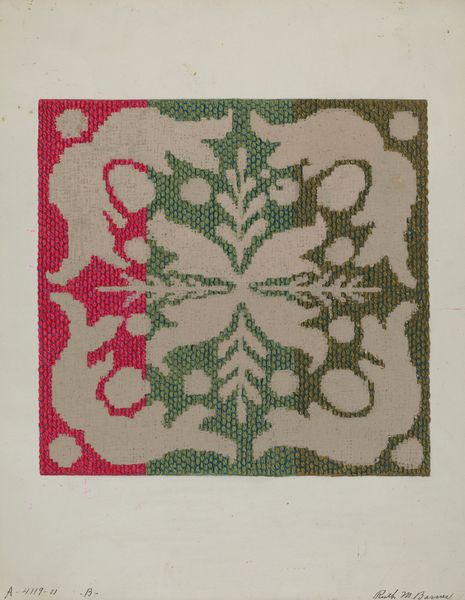 Curator: At first glance, it just hums with a peculiar domestic tranquility, doesn’t it? Almost… kitsch. Editor: Let’s take a closer look at Renee A. Monfalcone’s "Afghan," created around 1941. What strikes you is the deliberate patterning and its manifestation of the artist’s creative design process with fiber-art, textile design and drawing, where the subject is portrayed in regular, imprinted, layered repetition patterns. Curator: Patterns within patterns! It's like a quilt someone’s grandma obsessed over during a particularly existential winter. The colors feel so warm, yet something about that repetitive geometric pattern almost induces a sort of unsettling hypnosis. Does it remind you of anything in particular, or is that just me? Editor: The insistent geometry, its almost compulsive rendering, might lead us towards thinking of textiles as both comforting and constraining, simultaneously an act of nurture, a space for self expression, as well as one which imposes regularity on something essentially unbound: thread. The bright, somewhat flat application of red brings that tension to the foreground. Curator: Yes, I totally get the push-pull feeling here. It feels almost architectural, like some imagined building constructed entirely from knitted fragments. The ethnic patterning grounds it again somehow, making me feel safe-ish in what could otherwise feel alienating! Is it a natural stone pattern do you think? I feel like there is nature hidden within. Editor: It is fascinating how these associations build; one may interpret what appears organic, like flower petals or leafy boughs against rigid planes and a vertical design, or regard the design with no overt symbolism beyond exploring geometries. Whether it appears an "ethnic" pattern really depends upon whether such descriptions carry genuine ethnographic or social relevance. Curator: Fair enough, and perhaps my reading too eagerly embraces assumptions! Anyway, for me, the overall piece speaks volumes about how order can paradoxically emerge from chaotic repetition; it reveals, perhaps, what it really feels like inhabiting that tenuous boundary! Editor: Precisely. "Afghan" shows how a deep engagement with technique and material translates personal reflections on domestic objects that can express individual creativity and wider narratives on regularity versus freedom of expression.