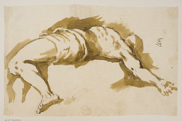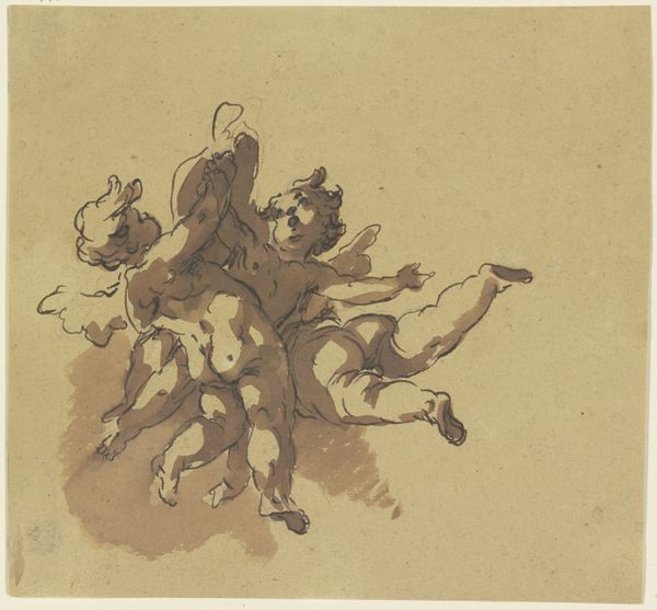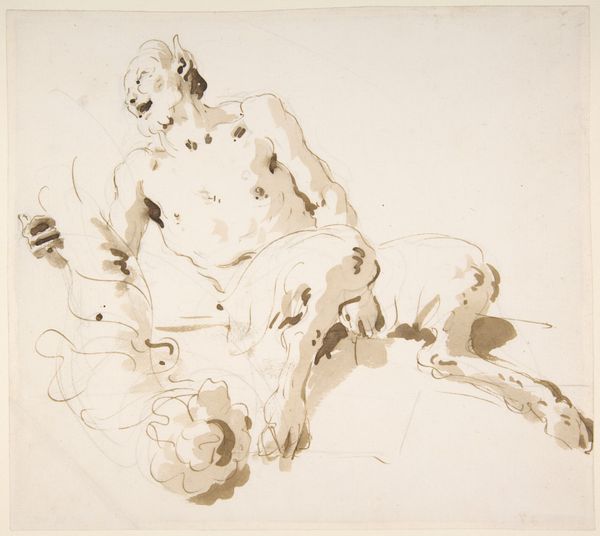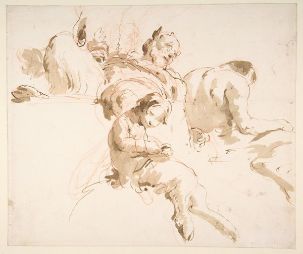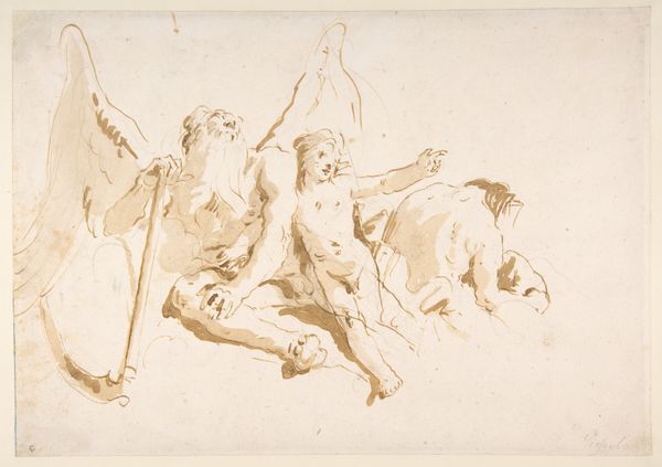 Giovanni Battista Tiepolo made "Time Seated, Clutching a Putto" using pen and brown wash over graphite on paper. It is a fine example of the immediacy and expressiveness possible with these simple means. The wash gives depth and volume to the figures of Time and the putto, creating a tonal range from light to dark that helps to define the forms. It evokes the softness of flesh and the texture of feathers, contrasting with the sharp blade of the scythe. The rapid, fluid strokes of the pen suggest a mind working quickly to capture an idea. The artist is also unafraid to leave lines exposed. You can see them under the application of the brown wash. This demonstrates a confidence in the medium and in his ability to make the figures come alive. Ultimately, this drawing reminds us that art is not just about the final image, but also about the process of making and the artist’s skillful manipulation of the materials.