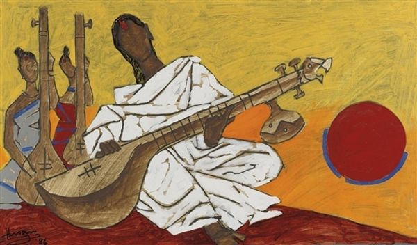 Paul Gauguin painted "The Guitar Player," a work now held in a private collection. The seated musician, bathed in ochre light, strums his instrument, and notes float upwards, taking on forms reminiscent of fruit. This imagery of music and fruit is intriguing when we reflect on its use in art history. Think of Caravaggio's Bacchus, where grapes symbolize both earthly pleasure and divine sacrifice. Here, in Gauguin's rendering, the musical notes metamorphose into round shapes, connecting auditory and gustatory experience. The motif of floating objects also harkens back to Renaissance depictions of the Annunciation, where the Holy Spirit descends as a dove. Gauguin perhaps suggests a similar form of inspiration: music emerging from the guitar as something divine. The barefoot musician, too, may echo the symbolism of humility and connection to the earth found in numerous religious paintings. This cultural memory embedded within shapes and gestures engages viewers, reminding us that symbols are never static but always evolving in a cyclical progression.