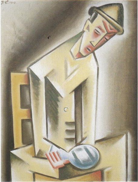 Editor: Here we have Josef Capek's "Piják s doutníkem," or "Drinker with Cigarette," from 1919, an oil painting. The geometric shapes create a very distinctive character, almost like a machine-made man. How do you see this painting, in terms of its message and methods? Curator: The first thing I notice is Capek’s use of oil paint. Look at how the viscosity and pigment are manipulated to create a sense of industrialized, even dehumanized, forms. He’s not just representing a figure; he’s showing us how modern society and mechanization were transforming even the human form into something almost manufactured, with this simplification to geometric forms, almost as though constructed in a factory. Editor: That's fascinating. So, you see the materials and production of the piece as integral to understanding the content? Curator: Precisely. Consider the social context: 1919, post-World War I. Mass production fuelled the war effort, with an incredible effect upon all segments of society, a kind of dark triumph of the manufacturing of everything. Capek seems to critique this. Notice the man’s vacant expression – is he celebrating, or simply dulled, by the fruits of this new era? Editor: I see what you mean. The man seems almost assembled, and not very expressive. The choice of oil paint contributes to the feel of it, making it more heavy. It sounds like, for you, it’s as much about how Capek made the art as what the art depicts. Curator: Exactly. By deconstructing the figure into geometric forms, Capek critiques the commodification of the individual that came with industrialization. Think of it as the art object embodying the same alienating process it critiques. Editor: That connection is so compelling. Now, I will always consider the method with the message. Thank you! Curator: My pleasure! The point is to never forget that artistic creation is a material act deeply embedded in its social and economic context.