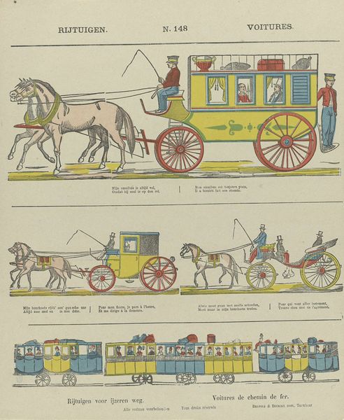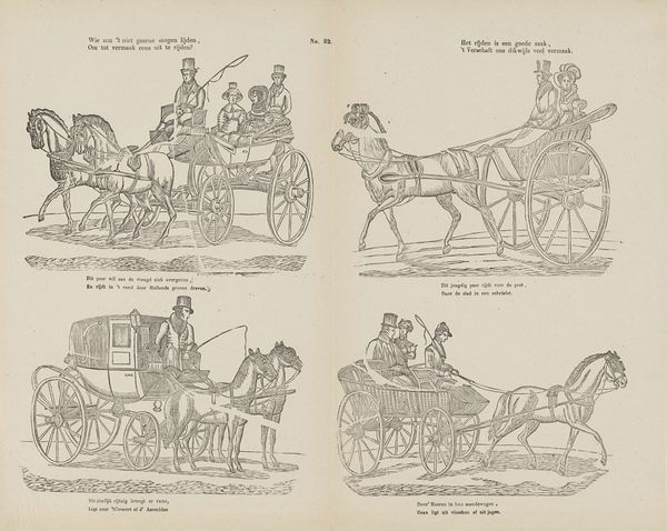 This print, made by Theodorus Johannes Wijnhoven-Hendriksen, presents us with a world neatly ordered into a grid of four scenes. Each vignette depicts a different horse-drawn carriage, yet the limited palette of red, white, and blue unifies the composition. These colors, sharply delineated, create a sense of graphic clarity. The lines are precise, almost mechanical, suggesting a world seen through the lens of rationality. The structure encourages a reading that is both sequential and comparative. The carriages, each slightly different, invite us to ponder the nuances of design and social status. Is this a celebration of progress, or a subtle commentary on the emerging class divisions of a rapidly modernizing society? Consider how the act of repeating the same motifs might subtly undermine the uniqueness of each scene, hinting at a deeper, more structural critique of societal norms and expectations.
