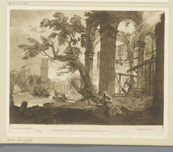 Curator: What a melancholic scene. A silent testament to time’s passage. Editor: This is Robert Adam’s "Architectural fantasy with ruins of an antique bath and cottages", rendered in ink on paper, back in 1776. Curator: The muted colors create this dreamlike atmosphere. See how the artist juxtaposes the decaying grandeur of classical architecture with everyday life in those small cottages. It makes you wonder, what stories these ruins whisper. Editor: Absolutely. Adam was deeply influenced by classical antiquity. Yet, he reinterprets those ruins, infusing them with Romantic sensibilities. The power structures have collapsed, leaving space for something new to be built. There are hierarchies in the composition too: we get these majestic ancient ruins, now juxtaposed with pastoral daily scenes, but a family in the front. It’s quite subversive. Curator: Notice how nature reclaims the space too – the vegetation, the light… This creates a sense of continuity; the idea that civilization rises and falls, but the earth endures, a timeless, and often romanticized concept of ruins and time itself. The presence of the antique structures are there not only to create beautiful lines, but also because ruins carried a powerful symbolic meaning in those days: vanitas and a desire to think of mortality and cycles. Editor: Indeed. And what about the figures Adam introduces? A man and child walking, people resting, a dog wandering alone in front. These touches animate the scene. Who lived here and how do the poor experience these monuments? Curator: The composition encourages us to look closely and meditate about their stories. Adam certainly understood the allure of classical imagery to invite to moral and historical questioning, just by looking at the marks of time on the architectural and societal structures. Editor: Ultimately, I view it as a powerful reminder that what once was, will inevitably fade. Still, from its remnants something else will grow. It gives me hope. Curator: I agree. There’s beauty even in the face of decay, perhaps even more beauty there.