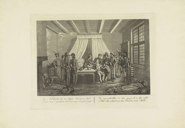 Editor: So, this print is titled *A chamberlain brings an invalid to King William I*, created by Jean-Louis Van Hemelryck in 1829. It’s an engraving, with an “old engraving style,” and it strikes me as a very formal, almost staged scene. What's your interpretation of what’s going on here? Curator: Well, considering it's a history painting made in 1829, we have to consider the socio-political landscape of the time. The print likely served as a piece of public imagery, carefully constructing a narrative around King William I. Do you notice anything in particular about the figures depicted and how they relate to one another? Editor: I see what you mean! The invalid, almost brought as tribute. And, how everyone is observing, as though for propaganda... Is it then an attempt to legitimize his rule in the face of past conflict? Curator: Precisely! By portraying himself in such a charitable light, King William is likely attempting to solidify his image as a benevolent ruler, easing any lingering tensions related to Dutch control of the Southern Netherlands. Editor: That's really interesting. I initially saw just a formal portrait, but you've really highlighted its potential role in shaping public opinion and solidifying power. Curator: Consider also the choice of medium—engraving—mass producible and easily disseminated to a broad audience. These prints entered public collections, like this one, shaping our historical memory. Editor: That adds a whole new layer of understanding for me, viewing art as active participants in a dialogue surrounding the public. Thanks for opening my eyes to the historical purpose behind even what looks like just portraiture. Curator: My pleasure! Art isn't created in a vacuum. By exploring its historical context, we gain insights into the political and social landscapes that birthed it.