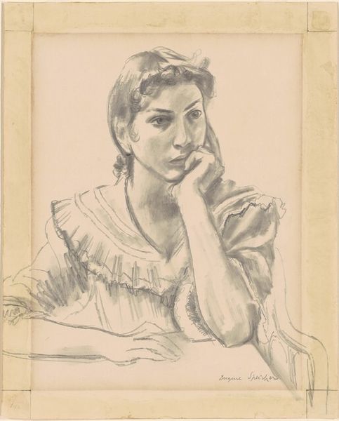 Curator: This pastel drawing, titled "Spaniard," was created by Arnold Peter Weisz-Kubínčan around 1930. Editor: The first thing that strikes me is its melancholy mood. There’s a quiet drama to the subject's averted gaze. Curator: I think that’s heightened by the material itself. Pastel lends itself to softness, but it can also achieve dramatic contrasts. The smudging here, how the black bleeds slightly into the skin tones, emphasizes the raw quality of the work, which can relate to expressionist movements. Editor: Absolutely, and it resonates with larger dialogues around representation of women during that time, especially in the context of interwar Europe. Who was this woman? Was the title given by the artist, and how does the "Spaniard" identity play into the power dynamics? Curator: The visible mark-making and subtle textures, though, highlight the artist's labor, drawing attention to the hand that created it and disrupting notions of effortless artistic genius, even pointing out some commercialized exoticism that was more accessible through printmaking and reproduced art at the time. Editor: We can also consider the concept of portraiture. Instead of idealization, there's an almost confrontational rawness in its execution, the vulnerability exposed. Is the sitter complicit in this display, or does it challenge viewers to contemplate their own expectations? The piece is, on its own, raising very big existential questions about the artifice and gaze. Curator: I'm also fascinated by how the artist’s choices manifest through accessible material and reproducible means that bring this conversation to a bigger stage: Pastel, a common medium. Paper, a ground that, with mass production of goods and materials, speaks to broader trends of production and consumption that go far beyond studio practice. Editor: Exactly. By investigating the material, the labor, and, obviously, the gaze, we begin to piece together a richer and deeper cultural and artistic interpretation of both its original context, the artist’s biography, and our current critical one. Curator: Precisely. Considering this dialogue can help to illuminate previously unexplored, potentially radical layers about works like this one. Editor: Right. I’ll certainly never see pastels in the same light again!