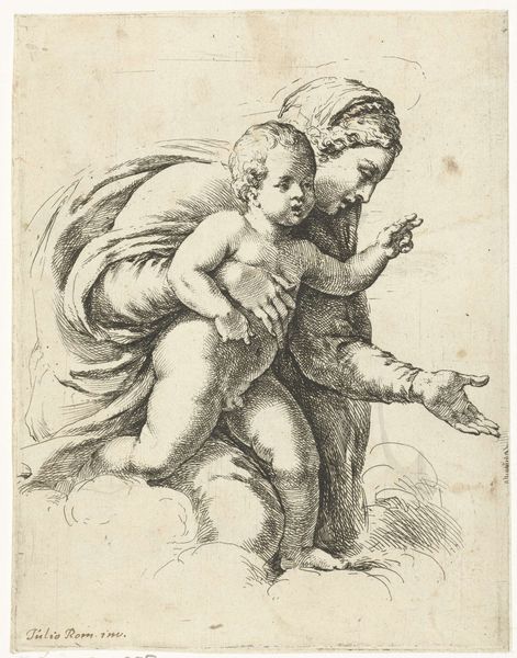 Curator: This is Frederick Bloemaert's "Caritas met drie kinderen," dating back to 1740. The piece on display here at the Rijksmuseum combines etching, drawing in ink, and paper support. Editor: The lines, especially in her drapery, really strike me. They're so precise, yet there's an undeniable softness conveyed, almost like capturing the fleeting moment of a maternal embrace. Curator: Bloemaert comes from a family deeply rooted in the artistic community, so naturally his skills would explore his materials in detail. The labor involved, the physical act of creating that fine line work repeatedly with his materials speaks volumes about baroque sensibilities of artistic craft. Editor: Caritas, as a symbol of charity and love, was quite common in Baroque art. Note the nurturing mother with three children clustered about her. She embodies the traditional icon of selfless giving. Do you get a sense of how many people likely encountered that symbolism then, shaping perceptions and perhaps even behavior? Curator: Absolutely, there would be workshops full of art such as this, replicated again and again, teaching certain values through careful labor and then widely distributed. The consumption and meaning intertwine— consider the kind of paper, the inks used and distributed. What kind of social classes would be privy to view or consume art such as this, and how might their reading of that consumption shape them in the late stages of Baroque art production? Editor: These pieces would probably remind the viewer about their Christian duty. Bloemaert leverages an instantly recognizable iconography; however, the etching and ink medium may soften some of the grandeur. Instead of just a moral lesson, does it bring a sense of shared humanity, perhaps focusing on personal interpretation? Curator: By questioning what is made and how and for whom, hopefully we allow space to include broader populations than the piece initially was able to be distributed. Editor: A look back helps illuminate our present as well as the symbolism surrounding acts of caring endure. It all echoes through time, doesn't it?