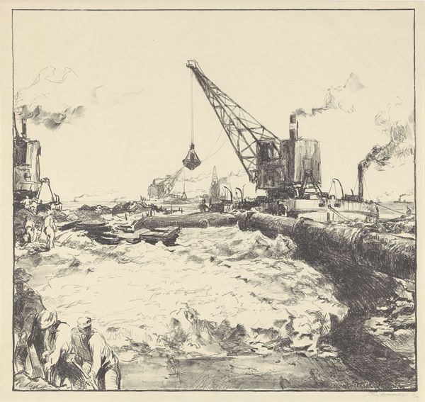 Robert Oliver Engard created this lithograph, *Grand Coulee Dam Construction,* using stark monochrome to capture the dam's imposing structure. The composition is dominated by sharp, angular forms. The rock face, rendered in dense, vertical strokes, contrasts with the smooth, cylindrical pipe bisecting the image diagonally. Engard employs a structured layout, dividing the scene into distinct planes. The foreground's rough texture gives way to the detailed yet distant activity atop the dam. The crane and figures are meticulously drawn against a backdrop of a dynamic sky. The print presents a play between man versus nature, using industrial components set against a landscape of raw geological formations. The artist's formal arrangement suggests a tension that is both powerful and potentially destructive, mirroring broader concerns about industrial progress and its impact on the environment.