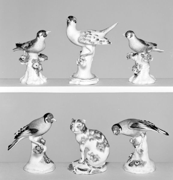 Curator: Here we have "Wagtail," one of a pair of rococo porcelain sculptures created by the Meissen Manufactory in 1733. The birds, perched jauntily, reside in the collection of the Metropolitan Museum of Art. Editor: My first impression is one of delicacy. It feels light, almost ephemeral. The smooth, pale porcelain and the precise modeling give the wagtail an elegant, refined air. It speaks of craftsmanship, of labor channeled into capturing something so seemingly simple. Curator: These birds encapsulate 18th-century symbolism—a sort of miniaturized pastoral idyll. Birds frequently signified freedom, joy, even the soul's flight toward heaven. The wagtail itself, with its distinctive tail movement, can also imply movement or even a light-hearted flitting between thoughts or locations. Editor: Absolutely. And that inherent contrast interests me: such immense industrial and social effort to fix and refine what is essentially 'the flitting’ made permanent through mining, labor and elaborate molding. It also implies the growing global trade in materials, with Meissen’s ambitions explicitly to copy East Asian porcelain recipes, itself made possible by exploiting materials and people across continents. Curator: Yes, Meissen was intensely competitive, spurred by Augustus the Strong's desire to replicate Asian porcelain’s whiteness and translucence. The bird, though naturalistic, has this air of aristocratic display – a controlled, porcelain representation of nature, created in contrast with their sourcing and the reality for many working people outside those gilded rooms. Editor: These tiny sculptures remind us how ‘nature’ has historically been co-opted as status symbol. Think about how this era and object represent consumption patterns. To create these objects involved industrial processes to manufacture such frivolous things! It reflects so clearly both human artistry and, indeed, a problematic system of social inequality. Curator: In many ways, porcelain birds like these embodied a desire to capture a piece of the untamed world within the confines of domestic life, imbuing those spaces with narratives of exploration and natural philosophy—very much how one’s own garden could stand in for a personal vision of paradise. Editor: Seeing "Wagtail" truly foregrounds the deep connection between material, making and symbolic meaning, particularly as it reflected then, and now, patterns of access to that world. It invites an ongoing dialogue on not just aesthetics but also value and exploitation, as it remains on display today.