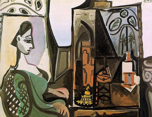 Pablo Picasso made this painting, "Femme dans l’atelier," using traditional oil paints on canvas. The thick application of paint, visible brushstrokes, and bold color choices give the work a tangible quality, emphasizing the materiality of the paint itself. Picasso engaged with the long history of painting but wasn’t afraid to bend the rules. This work has a casual, immediate feeling, as though he were dashing it off. Look at the window and plant in the background. With its architectural features and stylized foliage, it's almost like a stage set. And in the foreground, you see the tools of his trade – the easel, the canvas – becoming part of the composition itself. In this context, even the act of painting becomes a kind of labor, a job to be done. Picasso elevates the mundane details of artistic production to become the subject of the artwork itself. It's a reminder that art-making, for all its creative flair, is also a craft, a process, and a kind of work.
