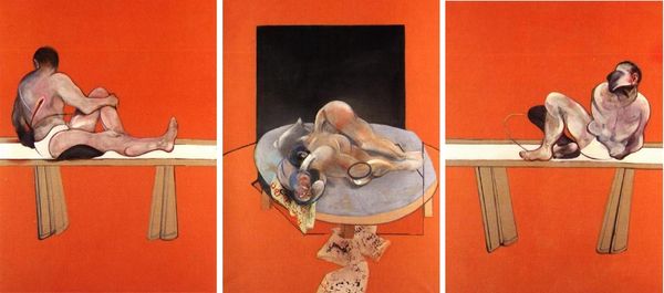 Francis Bacon created "Three Figures in a Room", using oil on canvas to unsettling effect. This triptych presents a disquieting vision of the human form within confined spaces. The figures appear distorted, caught in moments of introspection or existential distress. Bacon's use of color and space is particularly striking. The muted palette of fleshy tones, grays, and deep blues creates a somber atmosphere, while the stark, minimal backgrounds amplify the figures' isolation. Notice how the composition emphasizes the grotesque and vulnerable aspects of the human body. It is achieved through expressive brushwork and the deformation of anatomy. These techniques challenge traditional ideals of beauty and representation. Ultimately, the painting's power lies in its ability to evoke a sense of unease and introspection. It reflects broader philosophical concerns about the human condition. The figures invite us to confront the darker aspects of existence. The unsettling quality of "Three Figures in a Room" pushes the boundaries of figurative art. It leaves a lasting impact on viewers.