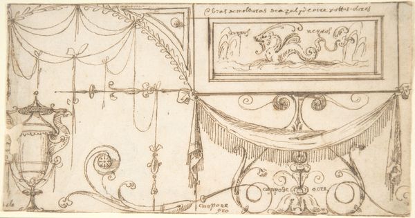Curator: At first glance, this ink drawing feels rather dreamlike. Its pale, ethereal lines hint at something delicate, yet slightly grotesque. Editor: Indeed. What we have here is a sheet of studies made between 1500 and 1560, intended as grotteschi details for the Domus Aurea. It’s by an anonymous artist and is currently held at the Metropolitan Museum of Art. It showcases decorative elements. Grotesque, of course, meaning, in Renaissance terms, not ugly but rather a playful mix of human, animal, and vegetal forms. Curator: That certainly chimes with what I am seeing. A playful, fluid energy expressed through these whimsical shapes and almost architectural fragments. Do you find it significant that it's attributed to an anonymous creator? Does the absence of a known artist perhaps shift our understanding? Editor: In a way, yes. It allows us to move away from a cult of personality and focus instead on the collective creative energies and cultural aesthetics prevalent at the time. One might consider that these are not so much singular artworks but records of a wider cultural conversation, reflecting and shaping Renaissance sensibilities about beauty, the body, and the classical past. What does it suggest to you, artistically? Curator: The emphasis on line is striking, almost calligraphic in its quality. Note how each flourish and curve is rendered with such precision and control; these delicate, floating shapes make me think about the transience and artificiality of the decoration itself. The swan eating the plant looks very mannerist, with a stylized elegance. Editor: It is almost like observing the very grammar of ornamentation. Consider the impact of such designs. The rediscovery of classical motifs deeply affected Renaissance art and this piece testifies to the creative energy unleashed at the time. In its fusion of human, animal, and plant-like forms, there's perhaps a silent rebellion against established, static categories. It questions how art could liberate itself and influence the culture. Curator: Yes, a visual language that speaks volumes. Overall, the image appears weightless—ethereal forms seemingly suspended in air. And from that airy lightness also emerges the cultural underpinnings and complexities of the work itself. Editor: Ultimately, a conversation starter.