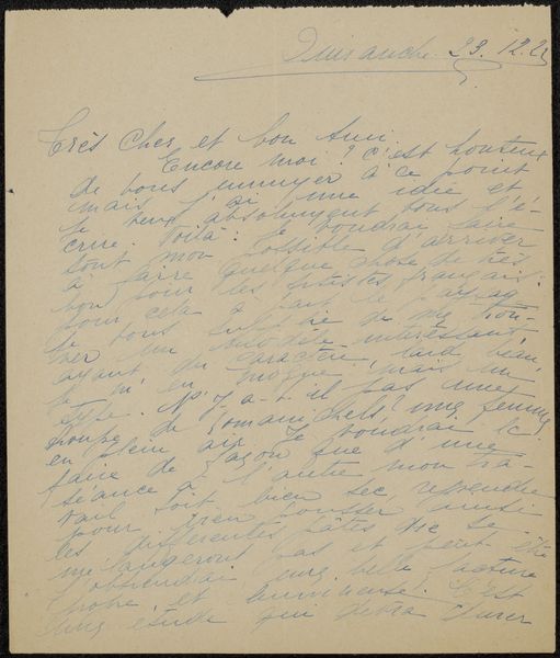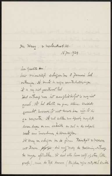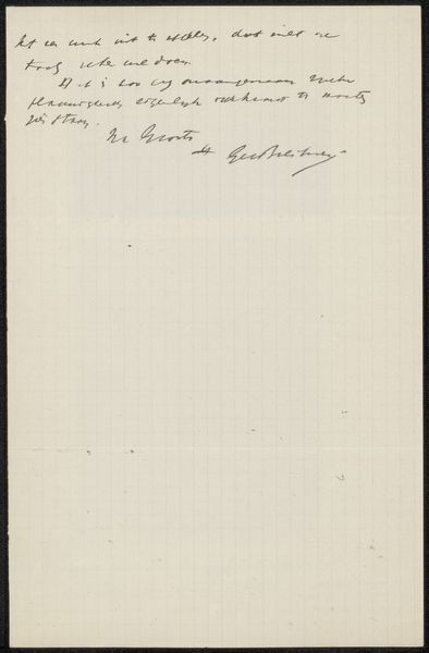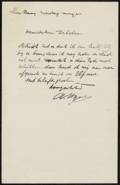 Curator: At first glance, the composition appears quite sparse—mostly unadorned paper, its lines meticulously ruled. The date, inscribed delicately near the top, hints at something more. Editor: It has a melancholic feel. The faded paper, the handwritten script, the almost ghostly quality of the ink—it feels like holding a piece of time itself. Tell me more about this work. Curator: Certainly. What we're looking at is entitled "Transcripties van brieven aan Philip Zilcken" or "Transcriptions of letters to Philip Zilcken". It's attributed to Pieter Haverkorn van Rijsewijk, and while undated, the inscription on the page seems to read January 29, 1892, likely the earliest this would have been executed, though this date seems later applied, thus, “after 29”. The piece consists of ink on paper. Editor: It seems incredibly personal, the lines hinting at correspondence. How did someone like Zilcken affect Rijsewijk’s work? What context do these letters provide about Rijsewijk as a political figure, if any? Curator: That’s the crux of it, isn't it? This isn't a finished piece, but rather a leaf from what appears to be a personal sketchbook, likely, preliminary studies or experiments in typography. Editor: I wonder how the act of transcription shaped the understanding between Rijsewijk and Zilcken’s world? Each copied line—almost a meditative act that forges a social bond beyond words. What did each one gain from that partnership? Curator: One can only speculate what the artist discovered from Zilcken's correspondence. Focusing on the structure of this page and this exchange: Rijsewijk's exploration of script transcends pure representation. See how the variations in pressure affect the line weight; observe the intentional flourishes within individual letterforms. It is not just an exercise in duplicating text, but an interrogation into visual rhythm, form, and calligraphic mark-making. Editor: I concur. To see just one letter opens the audience to consider just one element that fostered so much creativity! Curator: Absolutely, it shows how we find inspiration through many sources, no matter how great or small. Editor: What a great sentiment to leave with; I know I have a few new ideas!