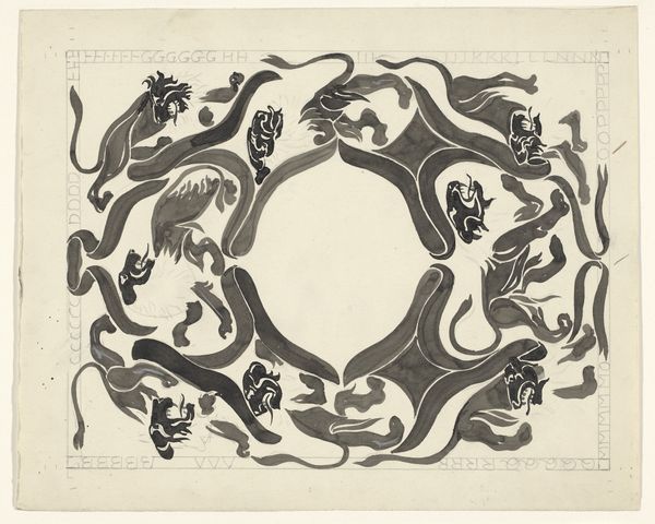 Curator: Here we have "Zeven Gekroonde Muizenkoppen," or "Seven Crowned Mouse Heads," a pen and ink drawing by Willem Wenckebach from 1898. It's currently held in the Rijksmuseum. Editor: It strikes me as quite whimsical, almost absurd. The crowned mice arranged in this symmetrical, fountain-like composition, against the stark black and white background...there’s something almost unsettling about its playful nature. Curator: The use of anthropomorphic animals during the Art Nouveau period was often allegorical, perhaps offering a critique of social hierarchy or satirizing authority through these unexpected figures. What do you make of its formal properties in light of its symbolism? Editor: Well, I find the strong, confident line work captivating. It gives a real sense of depth and structure, even within this bizarre scene. The geometric underpinnings provide an almost architectural framework for the seemingly random arrangement of mice, balancing the fantastical with calculated design. Curator: Indeed. Wenckebach, working within the late 19th-century Netherlands, was likely engaging with broader European trends of Symbolism and emerging Jugendstil aesthetics, and this piece certainly demonstrates an integration of those elements into something quite unique. One can speculate that the mouse, a typically humble creature, when adorned with crowns, becomes an emblem of societal anxieties regarding class and power. Editor: Precisely, the tension created between the mundane mouse and regal crown allows for layers of interpretation. Consider the restricted palette; its monochromatic austerity actually amplifies the dramatic effect of the radial lines and how they draw the eye toward the crowned subjects. This isn’t mere decoration; it is a carefully constructed composition making effective use of restraint. Curator: Yes, and understanding Wenckebach’s involvement in various artistic circles, particularly his engagements with debates on public art and national identity, enriches our understanding of this seemingly peculiar drawing. These crowned mice, though humorous on the surface, perhaps serve as a comment on Dutch society itself, hinting at broader themes of national character, leadership, and the subtle power dynamics at play within social classes. Editor: Fascinating! Analyzing it purely from a visual standpoint reveals just how effective Wenckebach's technique is, layering line, shape, and symbolism to invite many interpretations, a rich blend of technique and message. Curator: Precisely. It speaks to the layered richness one often discovers in historical works when delving beneath the immediate impression. Editor: A delightful and slightly unnerving piece—making the viewer question what is truly dignified and what merely appears to be so.