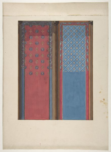 Curator: We’re looking at "Ontwerp voor de Tweede Bossche Wand: visoen van Johannes op Patmos", a design, likely from between 1869 and 1925, by Antoon Derkinderen. It employs ink, watercolor, and colored pencil on paper. Editor: Oh, this is interesting. There's a distinct sense of serenity… yet also an almost dizzying geometry in the top portion. It feels somehow... unfinished but incredibly deliberate in its planning. Curator: Deliberate is key. This is, as the title suggests, a design for a mural, a section of what would have been a much larger narrative cycle. Consider the careful layering of ink, watercolor, and coloured pencil. Editor: So, a material investigation of the visionary process. Derkinderen isn't just depicting a vision, he's architecting it through his selection of humble tools. It makes you wonder what those coats of arms that look to be in a sketch state might symbolize to the commissioner. Were the geometric choices imposed? Curator: Good point. The interplay of geometric forms with the organic—the figure of John, the eagles, the suggestion of a landscape—creates a dynamic tension. There's that circular mandorla that recalls the medieval illuminated manuscripts of biblical narratives, yet rendered with a certain modernistic clarity. Editor: And all of this, the deliberate archaism mingled with the modern, rendered in decidedly ordinary materials... almost defiant in a way. There’s nothing intrinsically “precious” about colored pencil or paper. He’s democratizing the very act of envisioning the sacred. It's a fascinating study in how something becomes art. Curator: Precisely. By exploring Derkinderen’s draft, it reminds me of how a sketch can often carry a powerful vision of its own, perhaps more potent because its execution contains the possibility of the image still becoming. Editor: Absolutely, and I am more convinced of its deliberate construction. It reminds us that materials and process are just as important as content in this kind of historic religious representation, if not more.