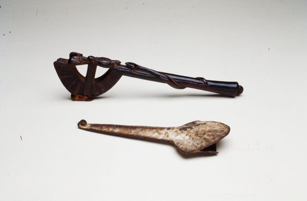 Curator: Here we have an object identified as a “Spoon”, originating from the Lozi people, and dating to around the 19th century. It's currently part of the collection here at the Minneapolis Institute of Art. Editor: Oh, my! It feels so personal, doesn't it? Raw, like a forgotten lullaby. That little bird figure perched on the handle… it looks as if it's guarding secrets, perched right there between the bowl of nourishment and the steady hand. Curator: The simplicity of its form, particularly the integration of avian imagery with a commonplace tool, is quite striking. We see a distinct emphasis on the manipulation of wood, revealing tool marks that narrate the process of creation. Editor: True, you can see how it’s shaped – it looks very elemental. I mean, can't you imagine someone patiently carving this by the firelight? Makes me wonder about the stories this spoon could tell… Who ate from it? Was it part of some ritual? Curator: It prompts us to think about function meeting symbolism. The Lozi are known for their complex social structure and craftsmanship. The spoon’s very existence suggests daily life intertwined with deeper meanings. Editor: The grain of the wood alone tells a tale of resilience. Imagine scooping up life itself with it, with every meal connecting someone back to their roots, you know? Curator: And the subtle asymmetry only adds to its inherent interest as an example of ethnographic artistry. Editor: Right! It is imperfect, which makes it sing. Art doesn’t need to be polished. Thank you, little Lozi spoon, for reminding us about soul and sustenance. Curator: Yes, indeed. A compelling look into how ordinary objects carry immense cultural weight.