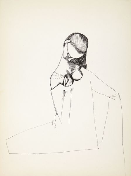 Curator: This sketch is titled "Female Image," a work on paper created by Hryhorii Havrylenko in 1977. The medium appears to be ink, using delicate linework. Editor: Oh, she's got that beautiful melancholic gaze, doesn’t she? Like she's remembering a lover who’s already shipped off to sea. You know, just scribbled onto paper. Raw and intimate. Curator: I appreciate your feeling about it! It is fascinating to consider this work within the context of late 70's portraiture in Ukraine, especially thinking about socialist expectations for representing women and the subtle ways artists could circumvent these rigid expectations even with a simple drawing. Editor: Exactly! There's a vulnerability, wouldn’t you say? An unveiled interiority. I see something there in the stark lines against blank spaces…the ghost of untold stories that peek from the subject’s gaze, if that makes sense. Curator: It makes perfect sense! What do you notice about the linework itself? Editor: Loose but confident, if that isn’t a contradiction. Like the artist trusted his instincts and understood the language to portray the most simple subject, to just suggest what matters and stop. Did he create preliminary sketches or...did it flow organically, do you think? Curator: That is difficult to say without additional insights. What’s evident, however, is that his stylistic choices subtly emphasize certain aspects – perhaps the slight downturn of her mouth or the soft shadow highlighting her profile — inviting us to reflect on this figure's potential emotional state and historical status as a woman. Editor: She lingers. Her beauty exists simply because we noticed it, a woman immortalized only by ink… What a lovely statement about existing for ourselves in art! Curator: A perfect observation and one I feel lucky to share a moment with, thanks! Editor: Anytime, pal!