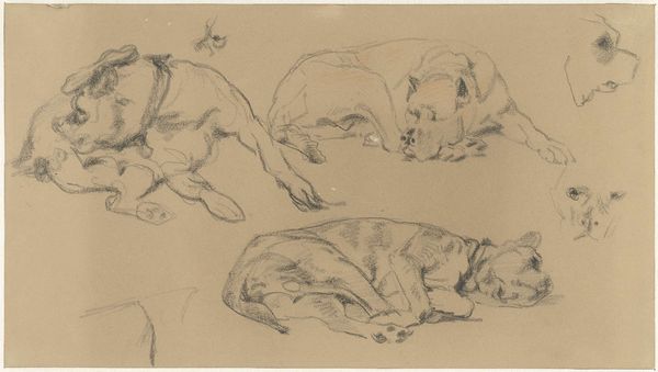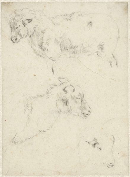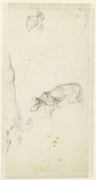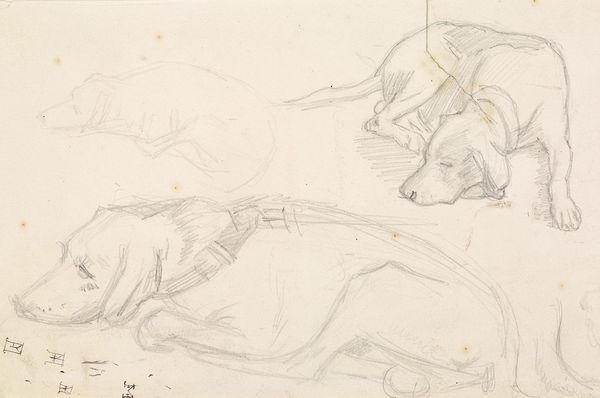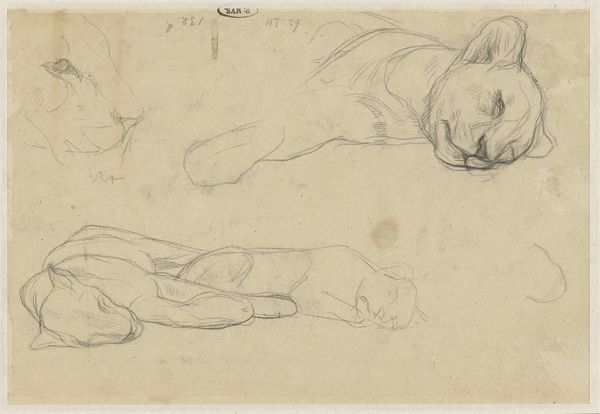 Curator: Jozef Israëls created these Studies van een Hond – Studies of a Dog – sometime between 1834 and 1911. It’s a pencil drawing on paper, currently residing here at the Rijksmuseum. Editor: Immediately, I feel a sense of intimacy. The fleeting quality of the sketch, that tender, searching line—it captures a sort of vulnerability, not just in the dog itself but also within the artist's hand. Almost like eavesdropping on a private moment of observation. Curator: Absolutely. Animal studies often act as windows into deeper, more primal aspects of human nature. Dogs, of course, are historically powerful symbols of loyalty, guardianship, and the wild spirit domesticated. Israëls, though, avoids romanticizing; instead, he distills the canine form to its raw essence. Notice how economical his marks are, yet how powerfully they suggest form and movement. Editor: It's interesting you mention movement. There's a lovely dynamism in that upper study—almost a premonition of Eadweard Muybridge’s motion studies decades later. It makes me consider all of the hidden layers buried beneath a deceptively plain surface. It gives me pause to notice these gentle graphite lines suggesting fur, muscle, bone. They bring me to the soul, perhaps. Curator: Indeed. Israëls worked within a Realist tradition that aimed to depict life authentically. But unlike Courbet’s confrontational realism, Israëls often sought a quiet, internal truth. The quick, almost impatient marks around the legs could imply impatience from the dog model, if it truly was a "real-life" encounter with one or more animals. This aligns with psychological ideas associating domestic animals with unvarnished instinct. Editor: Perhaps the impatience was on the artist's part, too, capturing a restless idea before it vanished. I wonder about the relationship between the artist and animal in those historical moments when animal companions started earning more visibility in painting. They weren’t merely accessories or symbols of wealth, as might be seen in grand portraits of previous eras, but, perhaps more simply, friends. It really adds another dimension to the composition. Curator: Food for thought. Considering how fraught symbolic relationships with dogs were during that era, his rendering feels both candid and considered. Thanks to its inherent simplicity, this seemingly simple sketch presents layered symbolic and creative reflections that keep enriching upon re-examination. Editor: You're so right. I can stare at it for another hour. This makes me contemplate the countless unsung sketches tucked away in museums, waiting to whisper their secrets.