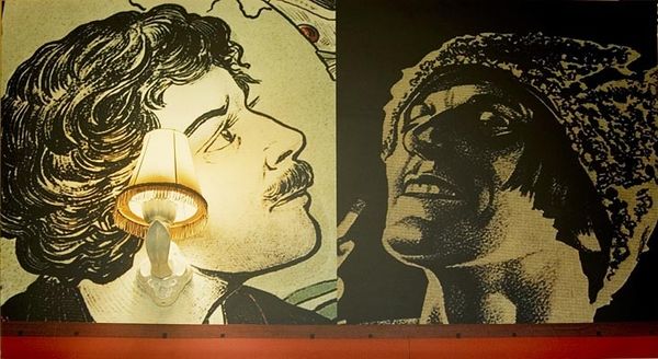 This is Erro's "Le Journaliste," and it’s a wild mix of pop and politics, painted sometime in the last century, I'm guessing. There’s a real immediacy to Erro’s work, a kind of bold, graphic punch. Look at how he uses those hard black outlines, almost like a comic strip, but the way he fills them in is more painterly, more like a dye. You get the sense of a process that’s both planned and spontaneous. The colors are saturated, but there’s also this flatter, almost matte quality to the surface. I love the way he juxtaposes the solid blue on the right with the chaotic energy of the figures on the left. That simple division creates a tension, a sense of two worlds colliding. Notice the way the journalist is framed against the blue, holding the magazine, as if he’s both inside and outside the narrative. It's a total head trip. Erro reminds me of a less anxious Sigmar Polke in his use of appropriation and cartoonish style. Both artists remind us that art is never truly original.