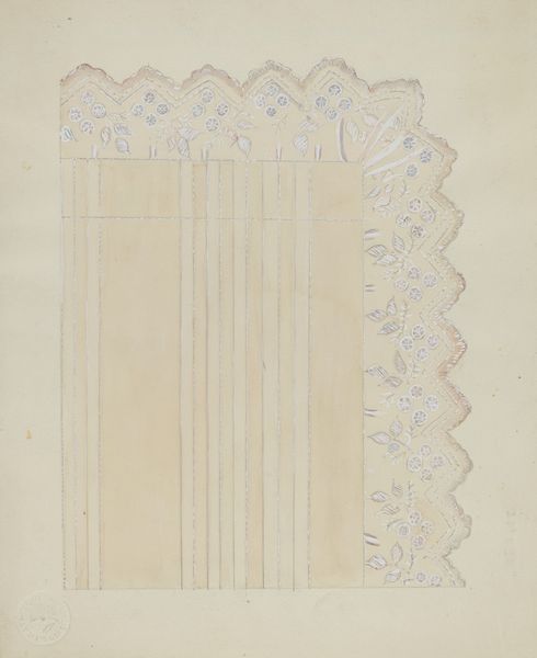 Curator: "Linen," a watercolor drawing created by Edna C. Rex between 1935 and 1942, presents a rather quiet domestic scene, wouldn’t you agree? Editor: It feels delicate, almost frail. The pale washes give it a transient, ethereal quality. The lines, though structured, seem ready to dissolve into the paper at any moment. Curator: The artist’s focus on linear elements is quite compelling. Note the repetition of vertical stripes. They establish a rhythm that is mirrored somewhat by a secondary micro-pattern, reinforcing structural unity. Editor: Those stripes immediately evoke for me ideas of shelter and enclosure. Lines as boundaries. The material of linen is deeply rooted in human experience too - think shrouds and swaddling clothes. There’s a hint of both vulnerability and protection at play here. Curator: Perhaps. Although, one could equally read the texture as a purely formal decision, part of the visual architecture. Look, too, at how the watercolor medium facilitates both transparency and subtle layering; this creates tonal variations which prevent any sense of flatness in this representational image. Editor: I still come back to the subject itself - simple, unadorned linen, depicted during a time of global conflict. To me, it represents a yearning for domestic stability, a return to a pre-war tranquility and simpler routines in uncertain times. It's a desire rendered beautifully. Curator: The symbolism you describe can exist in tandem with an exploration of form, creating the kind of rich complexity that can challenge and engage a viewer. That interplay between emotional context and formal choices really marks an artist at work. Editor: Indeed. Rex prompts us to appreciate the beauty found in the everyday and familiar. It seems a very profound, very humane act. Curator: I would just add that the subtle rendering also creates a sense of volume without harsh definition; and the eye is kept moving around the composition in very satisfactory way. Editor: It's true, one is certainly left contemplating far more than just a piece of linen!