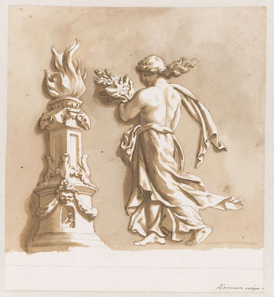 This drawing, by an anonymous artist, employs pen and brown wash over black chalk on paper, presenting a fragment of an overdoor design. The composition, though incomplete, features seated angelic figures and decorative cartouches, rendered in a muted palette of browns and grays. The artist uses line and wash to define form, creating a sense of depth and shadow that enlivens the figures. The fragment’s structure is built upon a baroque sensibility, seen in the dynamism of the figures and the swirling patterns of the cartouches. Semiotically, angels and garlands evoke themes of divinity, celebration, and abundance. The incompleteness of the fragment underscores a critical aspect of structuralism, suggesting the underlying systems of thought through their partial manifestation. Consider how the artist uses the incomplete nature of the work to engage with our perceptions of space and form. The fragment invites ongoing interpretation, highlighting art’s capacity to function beyond its immediate aesthetic presence and connect to a cultural and philosophical discourse.