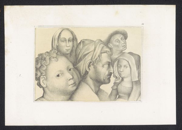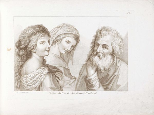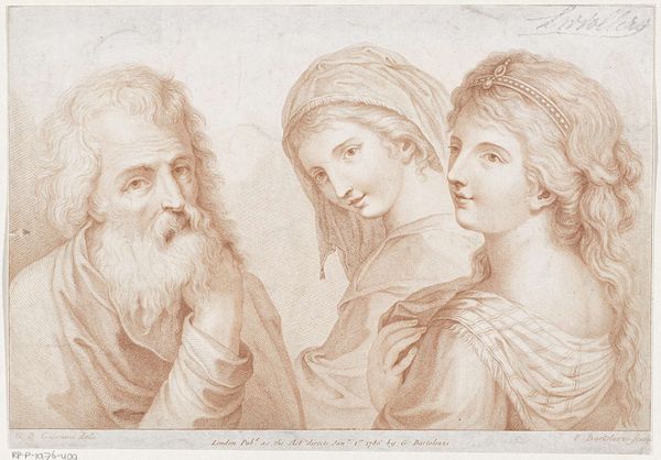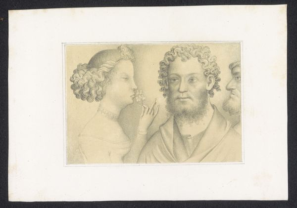 Karl Palzow made this delicate print, “Mannen verenigen jonge man en vrouw,” which translates to “Men unite young man and woman,” using a fine metal plate and an etching process. The image is created by incising lines into the plate, then applying ink and pressing it onto paper. Looking closely, you can see how the etched lines define the figures, giving form to their faces, drapery, and hands. The quality of the line is crucial here; it allows for subtle gradations of tone and texture, lending a sense of depth and realism. It is a medium associated with the rise of print culture, making images more widely available than paintings. Think of the labor involved: the skilled hand of the artist, the technical knowledge required to prepare and etch the plate, and the work of printing itself. It's a potent reminder that art is always the result of human effort, shaped by the social and economic conditions of its time. Appreciating these aspects enriches our understanding, and challenges traditional distinctions between art and craft.
