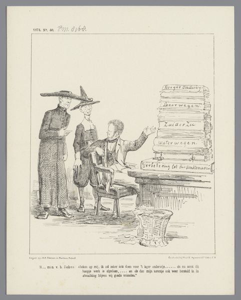 This is Johan Michaël Schmidt Crans’ lithograph from 1872, a commentary on Johan Rudolph Thorbecke and the law on higher education. The piece emerges from a period of significant change in Dutch society, particularly regarding education and governance. Here, we see Thorbecke at his desk, seemingly consumed by his work. Looming over him is Minerva, the Roman goddess of wisdom and strategic warfare. The visual juxtaposition speaks volumes about the tensions between the ideals of enlightenment and the practical realities of political life. Minerva’s accusatory tone suggests the emotional toll of governance, reflecting the weight of responsibility on individuals like Thorbecke. The goddess asks "Still working on higher education? Or will your law be ready in 1875 when the Leiden academy celebrates its anniversary?” Crans uses the figure of Minerva to critique not only Thorbecke’s actions but also the broader societal expectations placed on leaders. The artwork acts as a mirror, reflecting the public's hopes, fears, and judgments of its leaders during a transformative era.