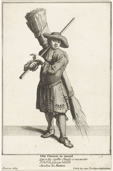 Editor: Here we have "Verkoopster van groente," or "Vegetable Seller," an etching by Giuseppe Maria Mitelli, from 1660. It's currently held at the Rijksmuseum. The image depicts a woman carrying a large basket on her head. I find it interesting how she gazes right at us, sort of a direct address that feels very contemporary, but also I wonder what everyday life was like at that moment in time, in a broader sense. What can you tell me about this piece? Curator: The directness is interesting, isn't it? Let's consider the broader context. In the 17th century, images like these, of ordinary people, became increasingly popular as prints. How do you think the medium – etching – might influence the artist’s choices, or our interpretation of her role? Editor: I hadn't really considered that before. Well, prints made art more accessible to a wider audience. It suggests a shift away from purely aristocratic or religious subjects, making art relevant to daily life? Curator: Precisely. Mitelli wasn't just depicting a vegetable seller; he was participating in a broader trend of documenting and, in some ways, idealizing everyday life. He’s framing the role of this vendor and perhaps subtly commenting on Bologna’s social fabric. Do you see the text beneath the image? It indicates that fresh salad comes at a high price. What social implications are shown or implied? Editor: Ah, so maybe he's using this seemingly simple image to also say something about class, or the economics of food at that time? Showing, in a populist format, that someone who provides everyday sustenance still demands a price in turn. I had missed that complexity at first glance! Curator: It prompts us to look beyond the surface. Art is never created in a vacuum; it's a product of its time and it can shape it, in equal turn. Editor: I guess what I’m walking away with is an expanded sense of the marketplace, how vendors actually reflect social dynamics through art. Curator: Exactly! Now we're really engaging with history.