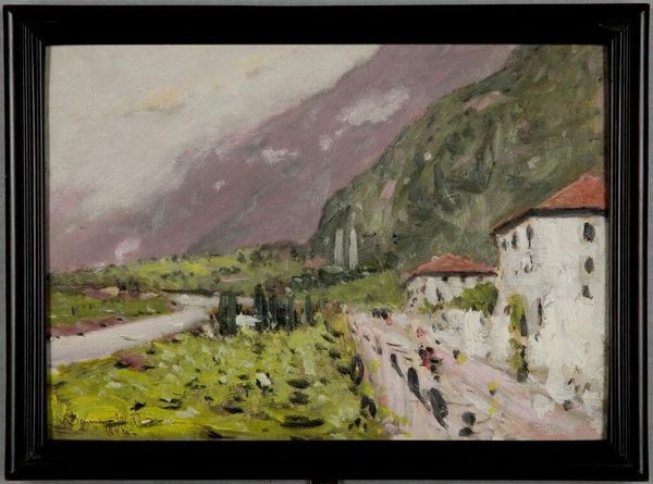Curator: Denman Waldo Ross’s watercolor, "Huts on the Side of a Mountain, Switzerland," presents a unique study in composition and perspective. Editor: It feels rather…untamed. The vibrant palette juxtaposes the rustic architecture against the imposing mountain backdrop. Curator: The juxtaposition is precisely the point. Note how Ross uses color to delineate space, pushing the eye upwards along the waterfall. It's a clear intentionality. Editor: Yes, but is it an accurate representation of life in Switzerland or a romanticized view? The setting feels idyllic, perhaps too picturesque to reflect reality. Curator: I think your observation is astute. Ultimately, the painting is about the tension between lived experience and artistic interpretation. Editor: A fitting thought to end on. I'll carry that away with me.