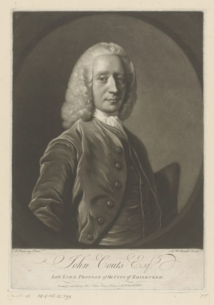 Curator: Ah, here we have a print titled "Portret van Stephen Poyntz," created between 1700 and 1756 by John (II) Faber. It's an engraving. Editor: The instant draw is the ornate dress. Each button looks like an explosion of fabric. How conscious do you think Mr. Poyntz was about projecting a specific image? Curator: Given the time period, highly conscious! This portrait, while technically a print, participates in a broader visual culture that served to solidify social hierarchies. Prints like these circulated amongst the elite. Faber's choice to work in engraving, known for its sharp detail, underscores the importance of accuracy and likeness in affirming identity. Editor: There's almost a theatrical element to the whole composition. The wig, the gaze, the slightly tilted posture all come together to convey status, definitely. What was the artistic environment like back then, during its creation, that influenced portraits such as this one? Curator: Portraits in the Baroque era often functioned as tools of state and instruments of family prestige. Artists like Faber were deeply involved in these complex power dynamics, commissioned to create idealized but recognizable likenesses of the wealthy and powerful. These prints offered broader access to their image and identity. Editor: Do you see it working on more than one level? As in, would its importance shift based on the audience viewing it? Curator: Absolutely. For those within Poyntz’s immediate social circle, the print reaffirmed their shared values and status. For those outside, it could inspire aspiration or, perhaps, resentment. The circulation of these images was a controlled form of publicity. Editor: And now, we have it hanging here! That time warp of intention to impact, fascinating! It makes you think about images nowadays and how differently they operate, doesn't it? Curator: It does, doesn't it? Reflecting on this artwork highlights the ongoing negotiations surrounding visual representation and power. Thanks for chatting about it with me.