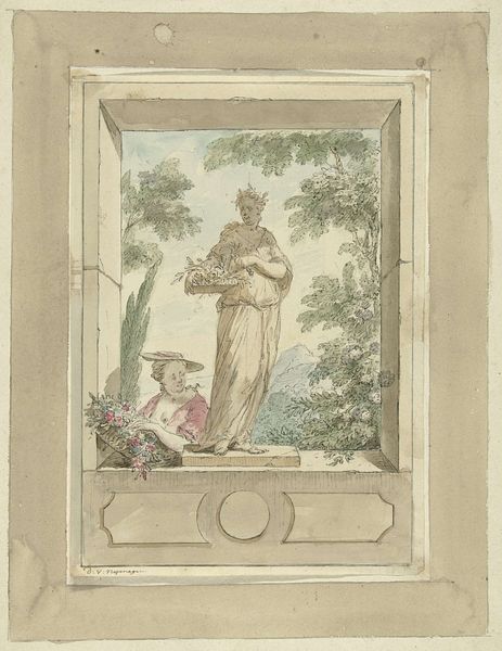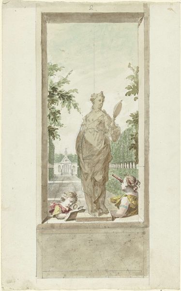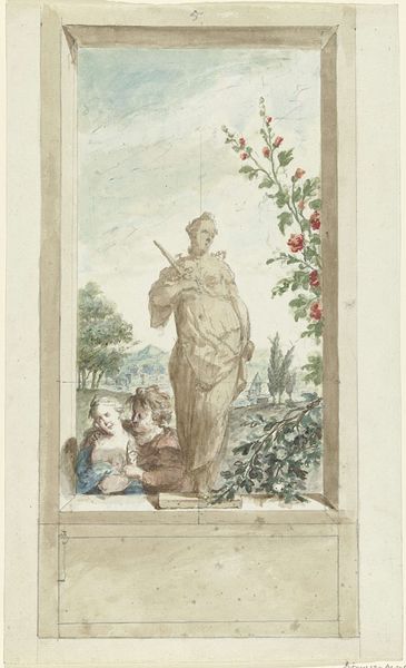 Editor: So, this watercolour and ink drawing on paper is entitled "Design for a Room Decoration: Statue of the Sense of Taste, Beside a Woman and Parrot with Fruit" and it's attributed to Dionys van Nijmegen, dating sometime between 1715 and 1798. The colours are so muted, and the composition so formal; I can't help but feel a bit removed from the piece. How do you interpret this work? Curator: Ah, a design, you say? Think of it like this, my friend. Imagine stepping back in time, into a grand salon. Sunlight streams through tall windows, illuminating this very scene, brought to life on a painted wall. Wouldn't that change how you feel about it? Van Nijmegen wasn’t just creating art; he was designing an experience. The allegory of taste becomes an invitation— to savour not just food, but life. And the woman, perhaps she's tempting us. Editor: That's an interesting point about it being a design piece. I hadn't considered it as something that would interact with its environment, rather than existing solely as art for art's sake. Does the parrot add anything to that experience? Curator: The parrot! A delightful touch, no? Imagine its squawks mingling with the laughter of guests. And don't you think the fruit represents temptation? It's a symbol of earthly pleasure. Perhaps Van Nijmegen means it as a wry commentary: a gentle reminder that even in refined settings, base desires flutter just beneath the surface. The overall mood becomes lively and dynamic instead of stiff, doesn’t it? What do you think now? Editor: I agree. Reframing it within its intended architectural space brings the drawing alive and completely alters my perception. Thanks for shedding light on that, it's been insightful! Curator: And for me, it's a joy to share a glimpse into the artist’s mind, and his world, no? A reminder that art is never truly silent.
