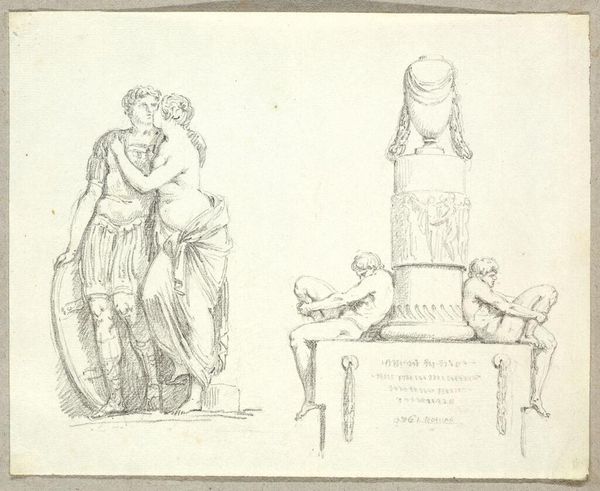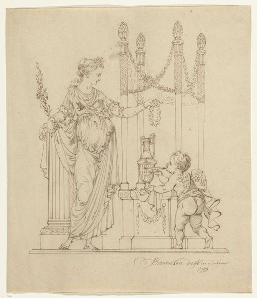 Editor: So, this drawing, “Grafmonument voor Frederik, prins van Oranje-Nassau, 1799,” at the Rijksmuseum… the date is a little unclear, sometime between 1807 and 1871. It's ink on pen, with a neoclassical style, and it evokes this air of mourning with its figure draped in sadness. What do you see in it? Curator: The weight of memory is heavy here. Look at how the allegorical figure sits, overwhelmed. This isn't just about individual grief, it's a cultural performance of mourning. The swan-like creature beside her echoes her sadness. But tell me, what does the geometric framework *around* her communicate to you? Editor: I see it now— the geometric structure contrasts with the figure's grief, right? Like a formal constraint on raw emotion? Curator: Precisely. The rigid structure suggests societal expectations and a need to memorialize within established boundaries. And what of that inscription within the medallion, high up near the top of the monument? Does it remind you of anything? Editor: The medallion with text inside seems related to similar memorial objects, and probably tells of someone’s status. I see some classical symbols too that represent lineage? Curator: Good. You see how symbols solidify a narrative around Prince Frederik. What do you make of how these combined components— grief, allegory, structure— impact the cultural memory of the Prince? Editor: It seems designed to make a lasting impact, a way to remember Prince Frederik in a noble, but still deeply human, way. This isn’t just about Neoclassicism; it is the psychological power of objects to shape how a person is perceived long after they are gone. Curator: I couldn't agree more. It shows us that even in grief, cultural symbols guide how we remember and relate to the past.