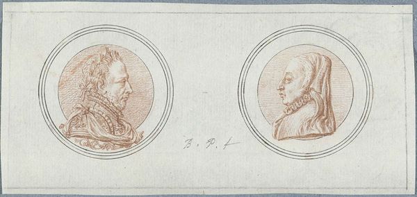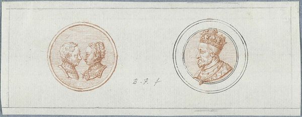 Curator: Look at this curious print, created by Bernard Picart sometime between 1683 and 1733. It's titled "Voor- en achterzijde van een penning met portret van Hendrik II, ter gelegenheid van het beleg van Metz," which translates to "front and back of a coin with portrait of Henry II, on the occasion of the siege of Metz." Editor: My initial reaction is… understated power. The simplicity of the ink drawing, the delicate lines forming the king’s portrait—it all whispers rather than shouts royalty, doesn't it? Curator: Absolutely. What's fascinating here is the commemorative nature of these types of prints. Think of it as propaganda art—carefully crafted imagery designed to sway public opinion in a particular direction during times of conflict. Metz, a strategically important city, endured several sieges, and images like this one played a part in shaping the narrative. Editor: And a slightly romanticized narrative at that. Henry II looks awfully stoic, awfully…clean. Is that meant to distract from the, shall we say, less than sanitary conditions of a prolonged siege? I love the detail of his royal garb! It feels opulent but restrained, much like this pen itself, doesn't it? Curator: Precisely. The reverse side of the coin design contains a crest, which further reinforces the themes of power and legacy. And consider the intended audience: these weren’t mass-produced images for everyone. This print, as it's presented, may be part of a book of compiled imagery, so it was designed to impress collectors or a specific segment of society. These images were investments into power, a long game, one of self perception for a population that viewed the monarchy with interest. Editor: It is clever, really. A small object promising an eternity of reputation. I'm intrigued how Picart’s technique, his clean and academic lines, lends itself to both commemorating a specific event and projecting a timeless image of kingship. Curator: Well, considering its journey through the ages, and into our collection, this carefully crafted print is definitely doing something right! Editor: It speaks to our need to create symbolic artifacts, I think, turning military events into art and icons into conversation. Good show, little print. Good show.