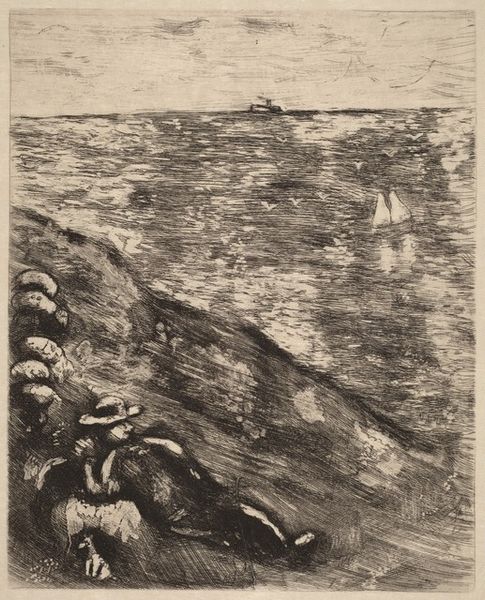 Curator: We’re looking at "The Drowned Woman," an etching made by Marc Chagall between 1927 and 1930. Editor: The texture immediately grabs me. It feels like the cross-hatching and delicate lines almost dissolve the image, lending an ethereal and tragic weight to the scene. Curator: Indeed, the formal choices contribute significantly. Chagall uses very fine lines, achieving tonal variations that build the impression of rippling water. See how the figure is placed at the bottom of the picture plane, anchoring our perspective in relation to the floating elements. Editor: It's powerful how the image stages a stark narrative. One can’t help but consider how the depiction of a drowned woman might resonate across social and historical contexts, opening avenues for discussion around gendered violence and vulnerability in early 20th-century society. Curator: Undoubtedly, interpretations may vary. Looking purely at its compositional construction, consider how Chagall employs abstraction. The reflected bench for example hovers above the woman's figure, establishing a deliberate distortion. These subtle artistic decisions guide our perception. Editor: Agreed, the semiotic language feels surreal. The water, the bench, and even the subject invite the viewer to ponder possible causes. Perhaps even the romantic roots of the piece reflect an underlying cultural fascination at that moment in time. Curator: These varying interpretations certainly invite more meaningful consideration, I feel. I’ve really noticed the skill in mark-making here today. Editor: It makes the work a very important intersection for discussing many points of discourse about romanticism and its relation to art’s narrative.