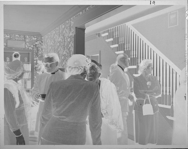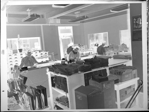 Curator: This photograph, simply titled "Untitled (office with receptionist and coatrack)," was created by Lucian and Mary Brown. Editor: The composition is quite stark. It seems to capture the mood of an office space, but the figures feel somewhat frozen or detached. Curator: Indeed. The image evokes a sense of institutional memory. The figures seem like archetypes of office workers, their postures and activities reflecting a bygone era of business culture. It reminds us of mid-century corporate environments. Editor: Perhaps it's the high contrast, but that coatrack and the waiting figure carry a certain symbolic weight. A transient space of potential and delay... what are they waiting for? Curator: The ambiguity invites us to consider the psychological space of waiting, the role of the receptionist as a gatekeeper, and the symbolism of the coatrack as a representation of transient roles. Editor: Well, seeing it through that lens enriches the image beyond just a historical document. It reveals something deeper about the human condition within such spaces.