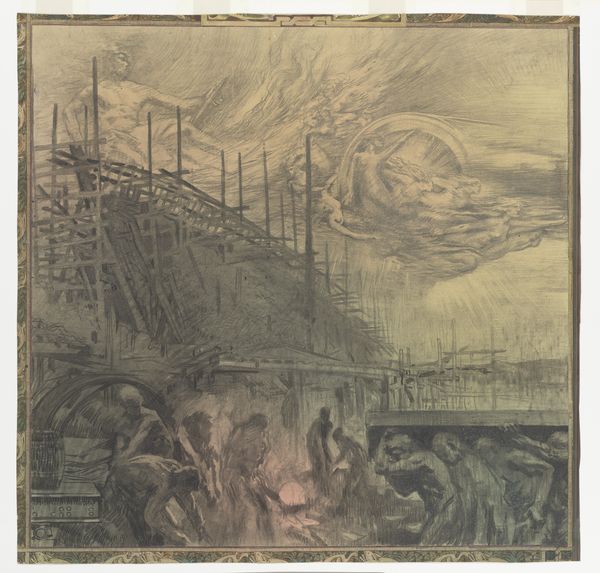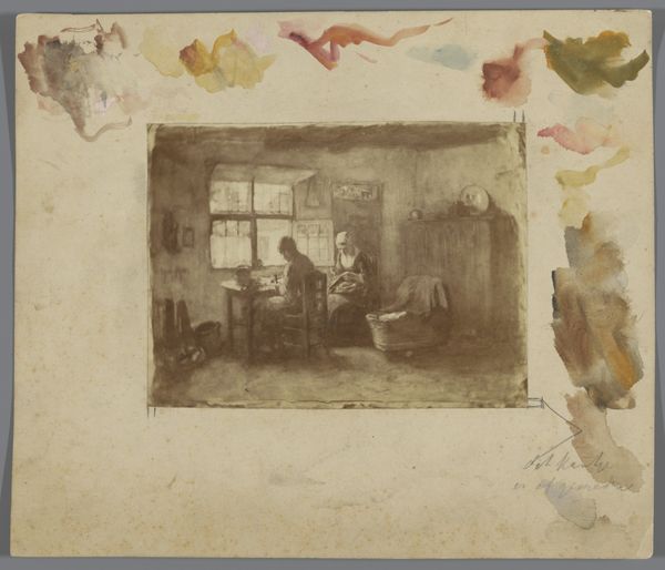 Editor: Here we have Johannes Arnoldus Boland's "Huiselijke sc\u00e8ne," which translates to "Domestic Scene," made sometime between 1848 and 1909 using drawing, print, and engraving. It strikes me as a detailed yet somewhat gloomy interior scene. What formal elements stand out to you? Curator: Immediately, the dense cross-hatching commands attention. It constructs not just form, but also value, effectively controlling the fall of light and shadow within the depicted space. Note how the artist uses the density of line to define form and spatial relationships. How would you describe the effect of this technique on the overall composition? Editor: It seems to compress the space, making it feel confined and intimate. The linear quality flattens the figures, almost like a tapestry. I’m also struck by the very narrow value range – everything exists in shades of grey. Curator: Precisely. Observe, then, the composition's structure. We might discuss this using the term *repoussoir,* to address the way darker forms at the foreground frame the lighter middle-ground and further recede into shadow and ultimately an indefinite space at the back. To what extent is there a creation of depth here? Editor: The figures at the back of the space seem undefined, maybe creating an intentional atmospheric perspective due to the limited tonal variation in that portion of the print. They lack clear outlines and feel somewhat integrated with the background. Is this solely a question of formal technique, or could it also carry thematic weight? Curator: Undoubtedly. The formal properties shape our experience, subtly evoking the domestic scene you noted at the outset, in all its layered complexity and the ambiguous character of that concept. It certainly draws our eye and invites further reflection upon line and value as potent formal properties. What further observations can you glean about our relation to that constructed space, considering how it positions and involves us, as the implied observer, within the artistic presentation? Editor: I see it now. Considering it less like a slice of observed life and more like a study in how light and dark, line and shape create form, the viewing experience evolves quite a bit! Curator: Indeed. A focused viewing predicated upon compositional and relational awareness opens entirely new and compelling vistas of art appreciation!