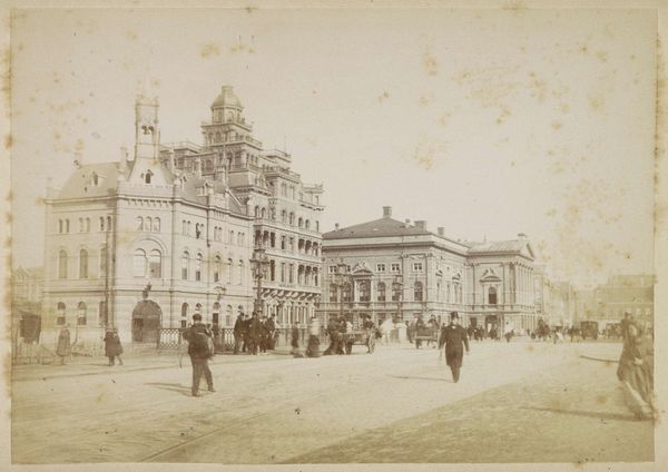 Curator: This is an albumen print capturing the exterior of the Saint-Eustache church in Paris, attributed to Louis Antoine Pamard, dating from somewhere between 1870 and 1900. Editor: It feels like stepping back in time. The muted tones give it such a melancholic and quiet presence, despite all those figures populating the space. Curator: Right, the albumen process lends that characteristic sepia tone. We're looking at a very specific convergence here: advances in photographic techniques intertwining with urbanization. Notice the sheer volume of people bustling about their daily lives juxtaposed with the static monumentality of the church. Editor: Absolutely! And you know, seeing the people milling about in their finery against this massive church makes me think about how places of worship function as centers of social life. This print really illustrates how the church served not only as a religious hub, but as a physical and spiritual cornerstone for community, don't you think? Curator: Indeed, we see here how photographic documentation served to legitimize and chronicle the transformation of Paris under the Second Empire. The albumen print, as a medium, became intrinsically linked with disseminating idealized urban imagery but the exposure here almost equalizes social hierarchy to the flat tone range of the process itself. The choice of focusing on the architecture is fascinating. It invites considerations of labor and the economics tied to image making and selling within cityscapes undergoing modernization. Editor: True, I can see that. It makes me think too about what the artist wanted to immortalize; capturing fleeting moments in history. The artist is present but in an understated way and the scale gives the space the feeling of intimacy with such grand themes. I like it very much. Curator: So, in considering the photograph of Saint-Eustache, we gain insights into not only a church's design and place within the urban environment, but the mechanics of the period. Editor: A frozen moment offering a window into so much—the intersection of belief, labor, history, even dreams and photographic technologies all held still on paper. I love it.