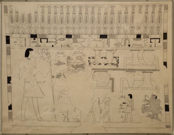 Curator: Here we have "Laden Donkeys and Men Plowing, Tomb of Djari" dating all the way back to 2050 BC. It’s a drawing, using ink on paper and part of the Met’s collection in New York. What strikes you when you look at this, Editor? Editor: Hmm, stark simplicity. Almost like looking at a page from a child’s primer on ancient Egypt, but with a rhythmic, repetitive quality that’s quite soothing. The figures feel suspended, almost floating, in their defined roles. Curator: Precisely. It’s important to remember the context. This isn't just decorative, it's functional art from a tomb. The meticulous rendering of daily life, like plowing, and donkeys carrying loads, serves a symbolic purpose, providing for the deceased in the afterlife. Editor: Oh, absolutely, it hits me like a visual prayer—a wish for continuity and prosperity. Those donkeys, are they meant to literally carry sustenance, or are they also symbolic vessels of wealth and labor? Curator: Both, undoubtedly. Donkeys were vital for transport. Each laden donkey symbolizes practical provisions, wealth, status and access to essential resources—echoing deeply held cultural values around sustenance. Notice also how the scale isn't realistic but proportional to importance—the ox pulling the plow seems huge compared to the people! Editor: I see what you mean—sort of a spiritual or emotional measuring system where daily life is magnified with meaning! Even the limited use of color emphasizes certain symbolic elements, grounding everything. The negative space hums! Curator: Indeed, Editor, you’ve put your finger on it. That starkness is purposeful, guiding our focus to essential elements in Djari’s world, or at least his envisioned afterlife. This visual clarity reinforces core Egyptian beliefs about the journey beyond. Editor: The journey beyond – maybe what appears simple is actually powerfully hopeful, and seeing the world of those animals laboring, walking along side people makes you imagine. I might like to wander into a landscape like that sometime… Curator: Thank you, Editor. The act of looking itself bridges millennia, linking our perceptions with those of ancient cultures. Each viewing renews our connection to ancient symbolic practices.