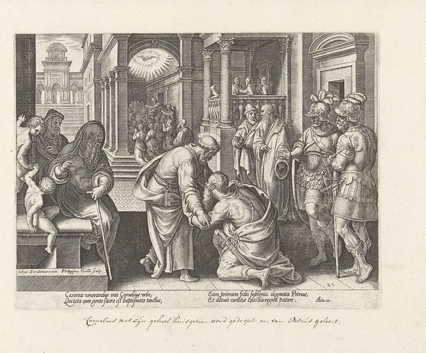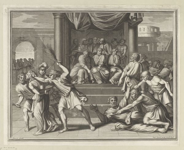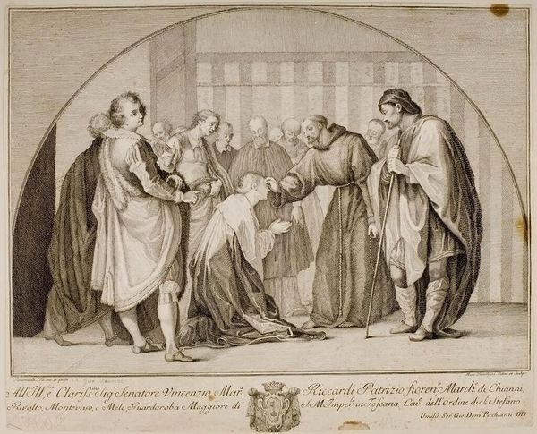 Bartolomeo Pinelli made this print portraying Meo Patacca receiving money from the gentlemen for the parties he wants to do. The composition centres on a moment of exchange, captured through the crisp lines of the engraving. The figures are meticulously rendered, with attention to the textures of their clothing. Notice how the lines vary in thickness to suggest depth and form, drawing the viewer's eye to the focal point where the money changes hands. The setting, though minimal, provides clues to the social dynamics at play. The clock looming in the background creates a sense of time but it also introduces the theme of temporality, and therefore the fleeting nature of social rituals and transactions. The gaze of the characters, and their gestures and movements, create a semiotic structure ripe for interpretation. It invites us to consider how the interplay of gazes and social performance define the era represented. Pinelli's print, through its formal qualities, serves not just as a historical record but as a social commentary, challenging our perception of 19th century society and the fleeting moments of exchange within it.