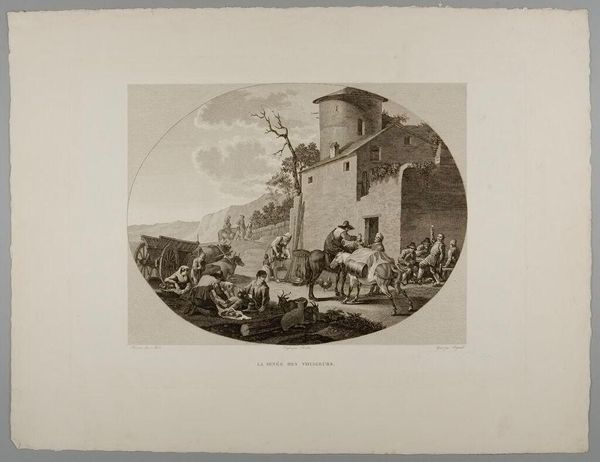 Curator: This is Aegidius Sadeler II's engraving, "February," a scene teeming with life—or perhaps the remnants of it, judging by the bare trees. What do you make of this wintry snapshot? Editor: It's bleak, isn't it? A real sense of trudging through the mud, both literally and figuratively. I get the feeling of a world slowly awakening, still burdened by the cold. Curator: Note the detail in the rendering of the figures, the way their activities, from gathering wood to transporting goods, reflect the labor necessary to survive this time of year. Editor: I'm drawn to the astrological sign of Pisces hovering above. It adds a layer of cosmic weight to the earthy scene, almost like a silent observer of human toil. Curator: Indeed, and remember engraving was a commercial enterprise. Sadeler’s skill lay in translating complex scenes into reproducible images for wider distribution and consumption. Editor: It’s a powerful reminder of the cyclical nature of life, labor, and survival, all etched into a small plate. Curator: A miniature world of wintry toil, skillfully rendered and widely disseminated, for a society grappling with the seasons. Editor: A little window into a world both familiar and distant—quite thought-provoking.