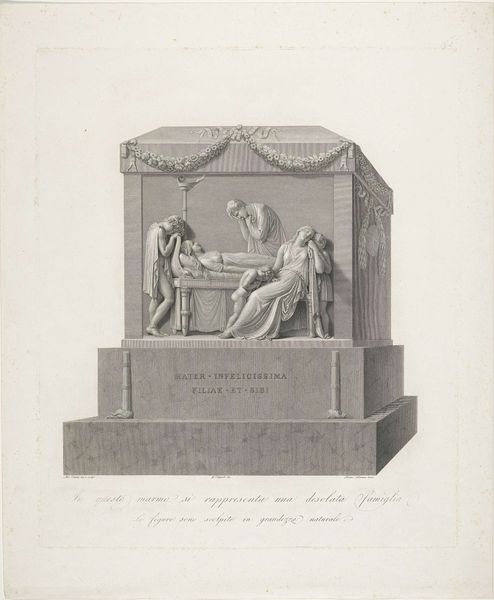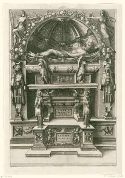 Curator: Looking at this print, made in 1786 by Johan van der Spruyt, we see the tomb of Hugo de Groot, who passed away in 1645. The print resides in the Rijksmuseum's collection. Editor: It is a stark but beautifully rendered neoclassical image, somber in tone due to the monochromatic engraving. The precision in the architectural detail strikes me. The sharp contrast enhances the overall dramatic feel. Curator: Indeed. The artist, working in the Neoclassical style, seeks to convey a sense of order, rationality, and civic virtue, very typical for this movement, which reacted to the excesses of the Baroque and Rococo. Hugo de Groot himself was a key figure, and his tomb becomes a symbol of legal and intellectual achievement. Editor: Visually, I'm drawn to the interplay of light and shadow within the structure, how the engraver managed to give form to the marble-like surfaces. Did you also notice the skull at the top? Curator: I did! It's a potent memento mori, serving as a reminder of mortality, quite common in memorial art throughout history. The cityscape or town view within the tomb's arch alludes to de Groot's world—his intellectual domain, his community and the ideas he shaped. The iron bars add a sense of distance between us and the object. Editor: That dome is constructed like a visual puzzle—a delicate assembly that serves both architectural and symbolic purposes. The formal geometry reinforces the rationality the engraver sought. Curator: And in considering that rationality, we should reflect on how the print itself, as a multiple, extends the reach of de Groot's legacy and ensures its continuity within the Republic's collective memory. Editor: A very interesting way of seeing it, connecting visual structures and political life to enhance public understanding of Hugo de Groot's life. Curator: Right. What the piece means as both a symbolic object and historical document remains incredibly evocative for contemporary audiences.