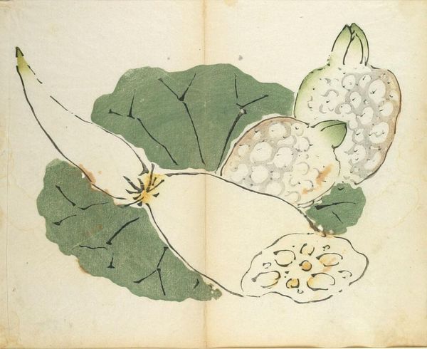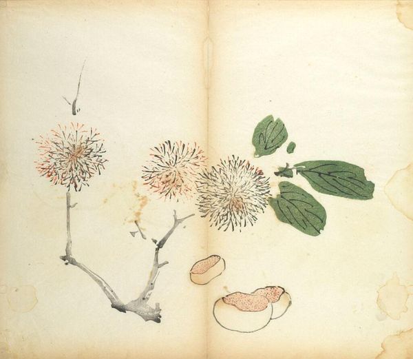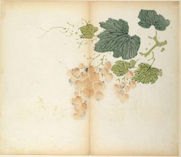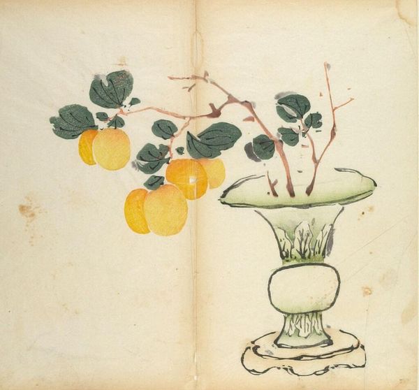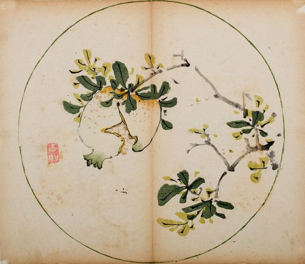 Curator: This image is titled "Fruiting Branches," an illustration from the Ten Bamboo Studio Manual of Calligraphy and Painting, created by Hu Zhengyan. Editor: It's simple, yet there's something very elegant about the composition. The off-white fruits, with their blush, stand out. Curator: The Ten Bamboo Studio Manual was a significant contribution to the printing world, and aimed to give scholars access to high quality images. Editor: I'm interested in that access. Mass production wasn't as common, and this put artwork in the hands of everyday people. Curator: Indeed, and this work showcases the woodblock printing process, which was so crucial for disseminating visual culture at the time. Editor: Looking at this now, it's easy to forget how revolutionary it was to democratize art production! Curator: Thinking of its place in history really changes how I appreciate the piece. Editor: Yes, and understanding the materiality and process helps us see the social impact this manual had.