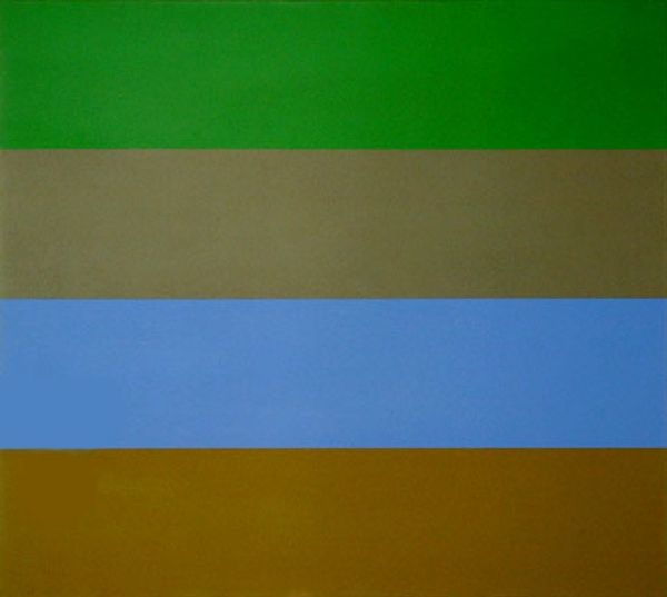 Curator: Jean Spencer, born in 1942, created this untitled work, and what strikes me is its almost austere quality. Editor: The canvas seems so intentionally spare, but I wonder if it's about the labor involved in achieving such flatness, such evenness of color. Curator: Perhaps. The dimensions are considerable: 1127 x 1501 x 22 mm. The size draws me in, inviting contemplation. It is oddly soothing. Editor: And yet, those colours – periwinkle, hunter green, a sort of raw umber – feel like remnants of a forgotten factory floor, a meditation on the process itself. Curator: A thought-provoking point. It speaks of the artist’s engagement with the post-industrial landscape. Editor: Ultimately, this painting challenges our assumptions. It makes us think about production and consumption of materials and labor in art. Curator: Indeed. A simple painting, a complex set of ideas. Editor: It’s like a meditation. I am still finding stillness here.