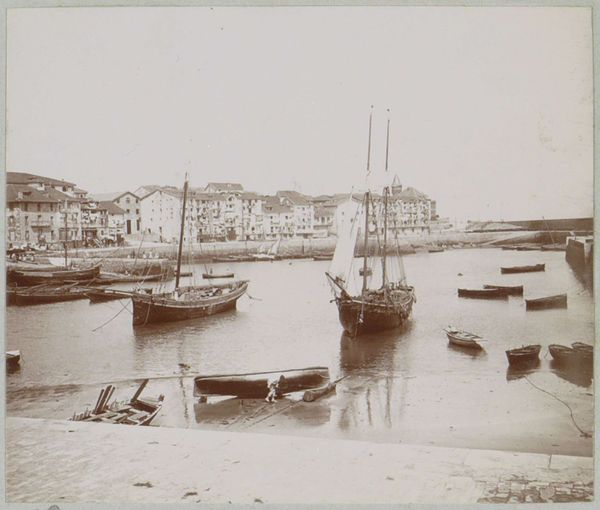Curator: This is "Gezicht op de haven van Martigues," a photograph by Delizy taken in 1903, currently residing in the Rijksmuseum. Editor: Thanks! This photo is captivating. The sepia tone lends it a sense of timelessness, and the composition, with all the boats clustered in the harbor, evokes a feeling of bustling maritime activity. What stories do you see woven into this image? Curator: This image provides an important lens for examining labor, urbanization, and photographic technology at the turn of the century. This is at the height of industrial capitalism, so I am particularly interested in this portrayal of Martigues, a small fishing village in the South of France, from this historical and social moment. I wonder, who benefits from this photographic representation and how does this image contribute to an ongoing narrative about urbanization, industrial progress, and labor? Editor: That's interesting. I hadn't considered the social implications, only the aesthetic value. Is that typical for impressionist work, do you think? Curator: The hazy sepia palette aligns with Impressionistic sensibilities of the era, but consider who’s often left out of these seemingly objective "snapshots." Were they, or were they not, at the forefront of Delizy’s conscious or subconscious vision of society and the changing world around them? This image allows us to think critically about these themes as well as question whose stories are remembered. Editor: That brings a totally new perspective to the photograph for me. I was stuck in the beauty of the moment but there is so much more. Thank you! Curator: And thank you for reminding me of the inherent beauty in the captured moment. Art history is a conversation, isn’t it?