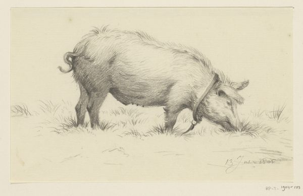 Editor: This drawing, “Liggende koe, naar links,” or “Lying Cow, Facing Left,” is attributed to Jean Bernard, and thought to have been made around 1828 or 1829. It's a pencil sketch on paper, currently held at the Rijksmuseum. It's quite simple, almost humble in its depiction of the animal, don't you think? What strikes you most about this particular work? Curator: I'm immediately drawn to the relationship between the artist, the materials, and the subject. Pencil on paper; seemingly basic, but think about it. Bernard is mediating the Dutch agricultural landscape through readily available, relatively inexpensive materials. This elevates the humble cow – tied to labor, to sustenance – to the realm of art. The availability and price of paper and pencils also shape what gets produced and who can participate in artistic expression. What does this say about the accessibility, or lack thereof, in early 19th-century artistic production? Editor: That's interesting, I hadn't considered the economic aspect of the materials themselves. It does change the way I view it, knowing these factors shaped his decision. So you’re seeing this drawing as more than just a representation of a cow? Curator: Precisely. We must consider the labor that sustains societies. Even this seemingly simple sketch points to the networks of production. Think about the production of paper itself and the mining of graphite for the pencil. What labor supported Bernard’s work, his art making? I think the work is more about social relations embedded in materials. It’s about a critical evaluation of materiality, rather than just about landscape as style. Editor: That’s quite different from how I initially approached it. I guess I was focused on the “realism” and overlooked those larger social components inherent in art making itself. I'll definitely consider those material processes and their implications in the future! Curator: Indeed, looking closely at these mundane images through a materialist lens helps expose broader economic structures embedded within artwork. It gives new meaning.