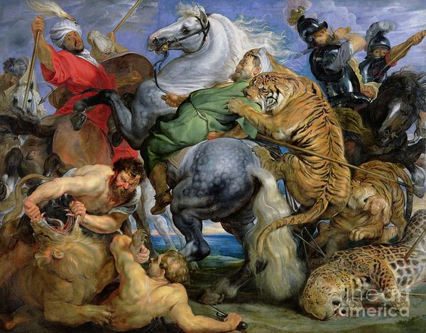 Curator: Roberto Ferri's 2012 oil painting, "I Cavalieri Dell’Apocalisse", which translates to "The Knights of the Apocalypse," truly commands attention. Editor: The figures leap from the canvas with terrifying energy, don't they? The muted palette—stormy greys and browns—adds to the overall sense of doom. It really hits you viscerally. Curator: The piece really showcases a dialogue between the old masters and contemporary surrealism. I'm struck by the means Ferri uses to create the swirling figures and his deployment of traditional oil paint to give us the sense of unfolding, historical allegory. Think about the implications in painting in this classical style today! Editor: I see the weight of historical symbolism. The skeletal horseman so explicitly evokes death, right? And consider the color choices—the ghostly pallor of one horse contrasts sharply with the others, probably to give you immediate feelings of death and decay. Each element contributes to a visual language of suffering and consequence that permeates Western culture. Curator: Yes, Ferri clearly understands the labor it takes to invoke this visual memory. The physical demands of creating these classical compositions – the grinding of pigment, the stretching of canvas – echo the themes of labor and suffering within the depicted scene. The whole painting becomes this material, durational performance. Editor: These aren't just historical representations, though. The figures are charged with an emotional immediacy. It's as if they’re meant to elicit an empathetic, even disturbing, recognition in the viewer. Are we the apocalypse? Curator: Right. This piece does ask its viewers to contemplate how society interprets and eventually consumes suffering, creating a complex interplay between artistic labor, historical weight, and commodified horror. Editor: It's a painting that, in many ways, continues to challenge my interpretations of its emotional intensity with each visit. The way Ferri has so dramatically staged these enduring symbols certainly leaves a mark.